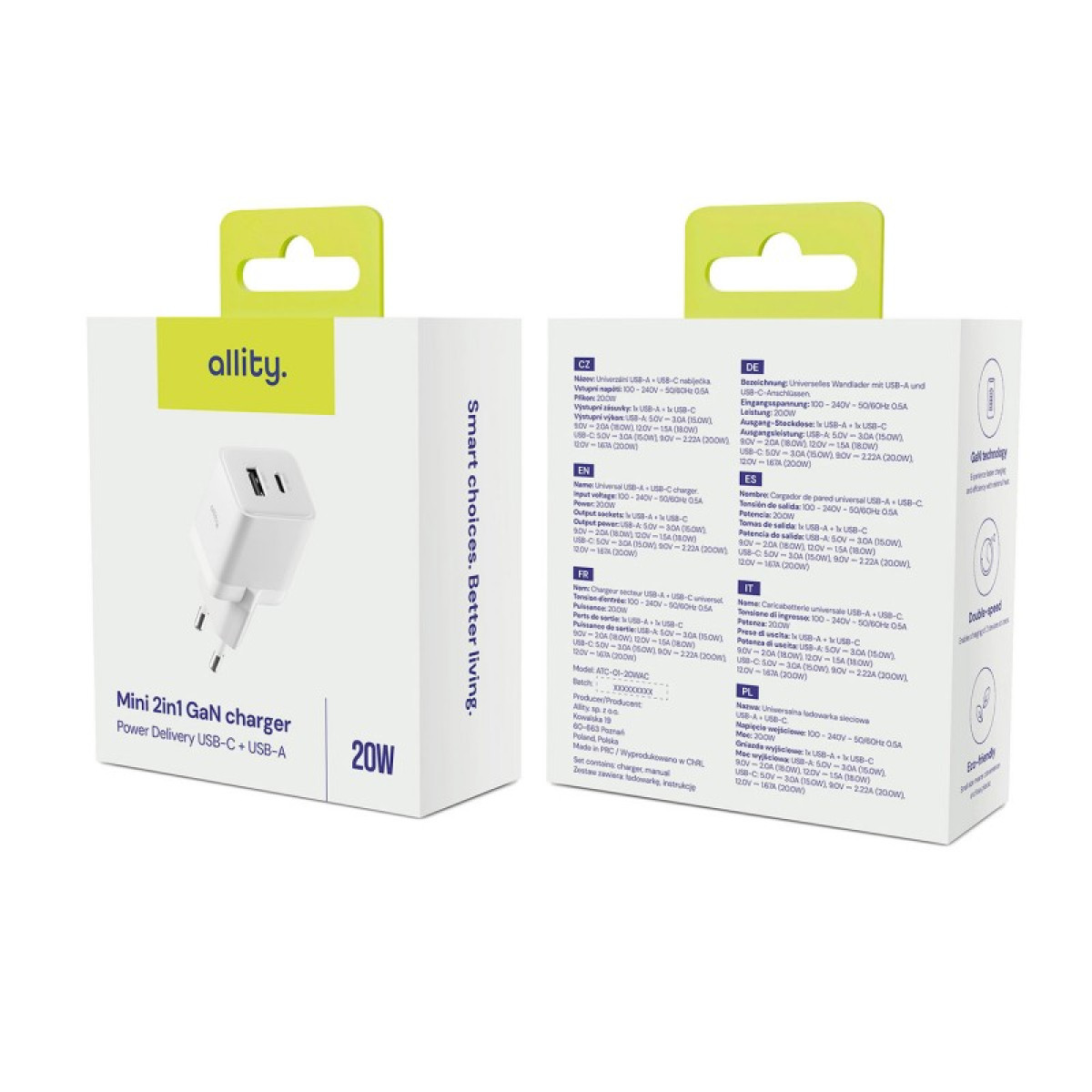 "Allity" sieninis įkroviklis GaN PD QC ATC-01-20WACr 1x USB-C 1x USB-A 20W baltas