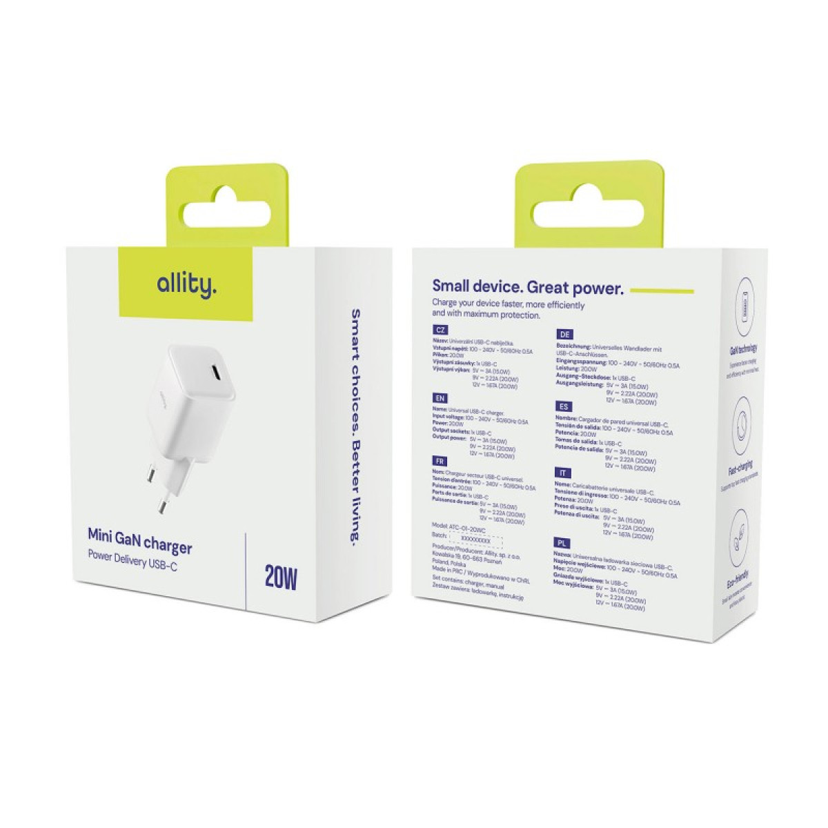 "Allity" sieninis įkroviklis GaN PD QC ATC-01-20WC 1x USB-C 20W baltas
