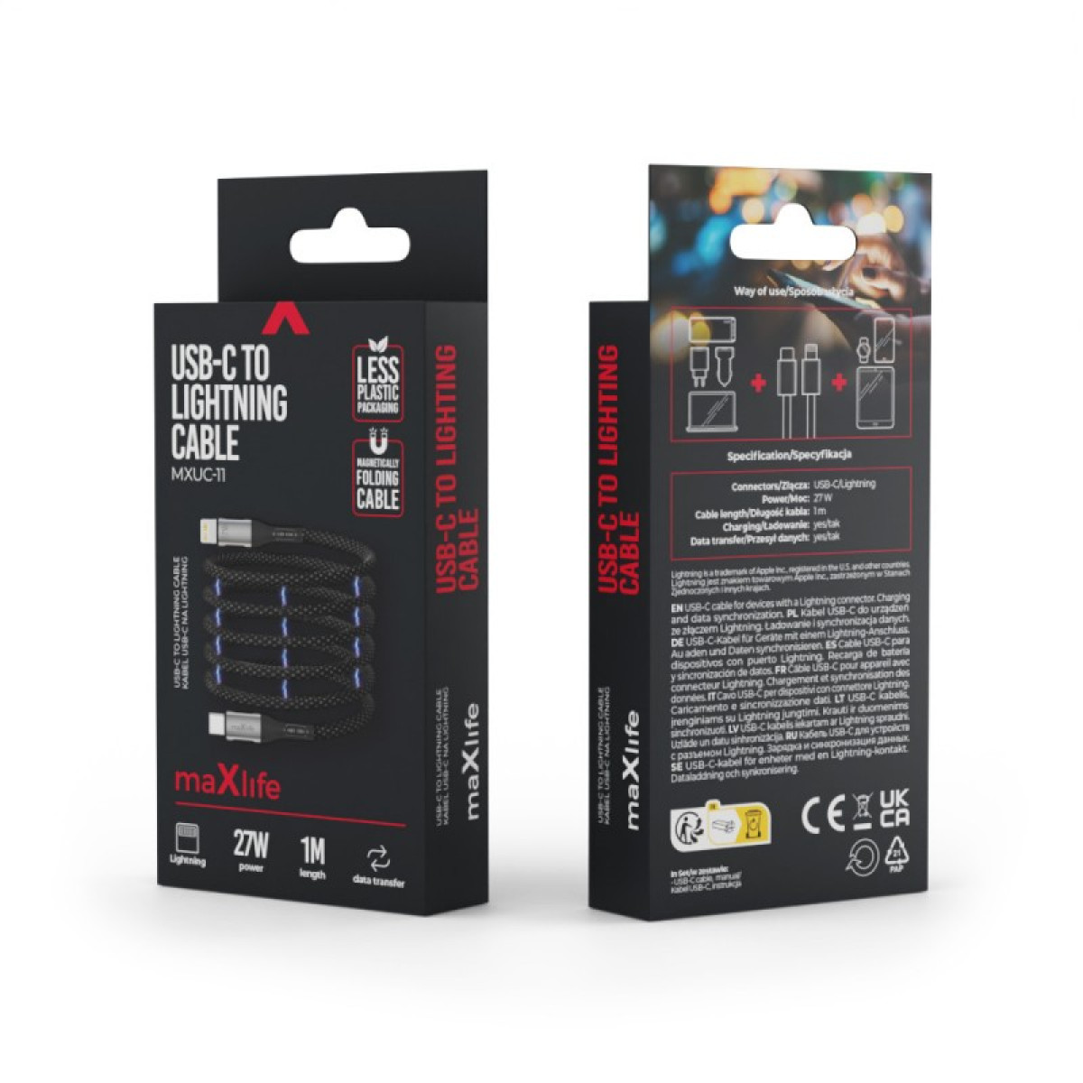 "Maxlife MXUC-11" magnetinis USB-C - "Lightning" kabelis 1,0 m 27W juodas nailonas