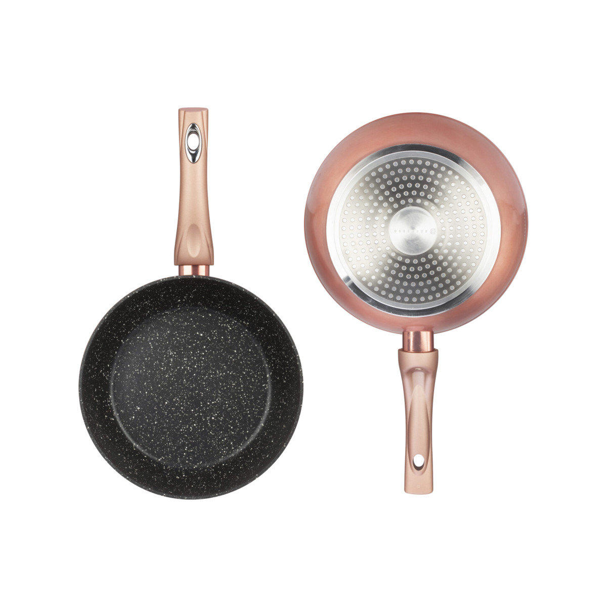 Šis rinkinys yra pagamintas iš presuoto aliuminio ir padengtas akmens masės keraminiu - marmuriniu sluoksniu, kuris užtikrina puikų šilumos laidumą ir yra atsparus įbrėžimams bei aukštai temperatūrai. Danga yra nelipni ir be PFOA, todėl puodų naudojimas ir priežiūra yra lengva.