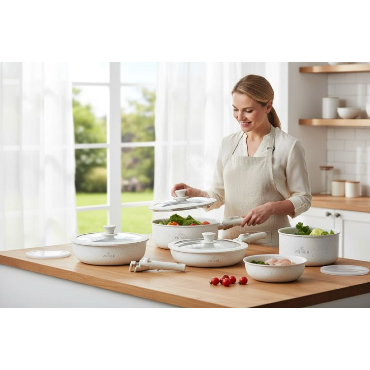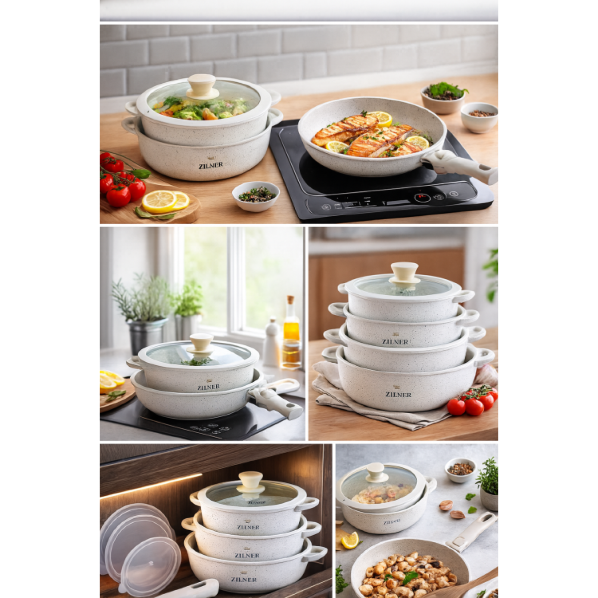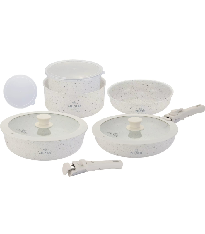 ZILNER ZL-8571 – modernus ir praktiškas puodų bei keptuvių rinkinys su marmurine akmens masės nepridegančia danga ir nuimama universalia rankena. Šis rinkinys sukurtas tiems, kurie vertina patogumą, kokybę ir vietos taupymą virtuvėje.
