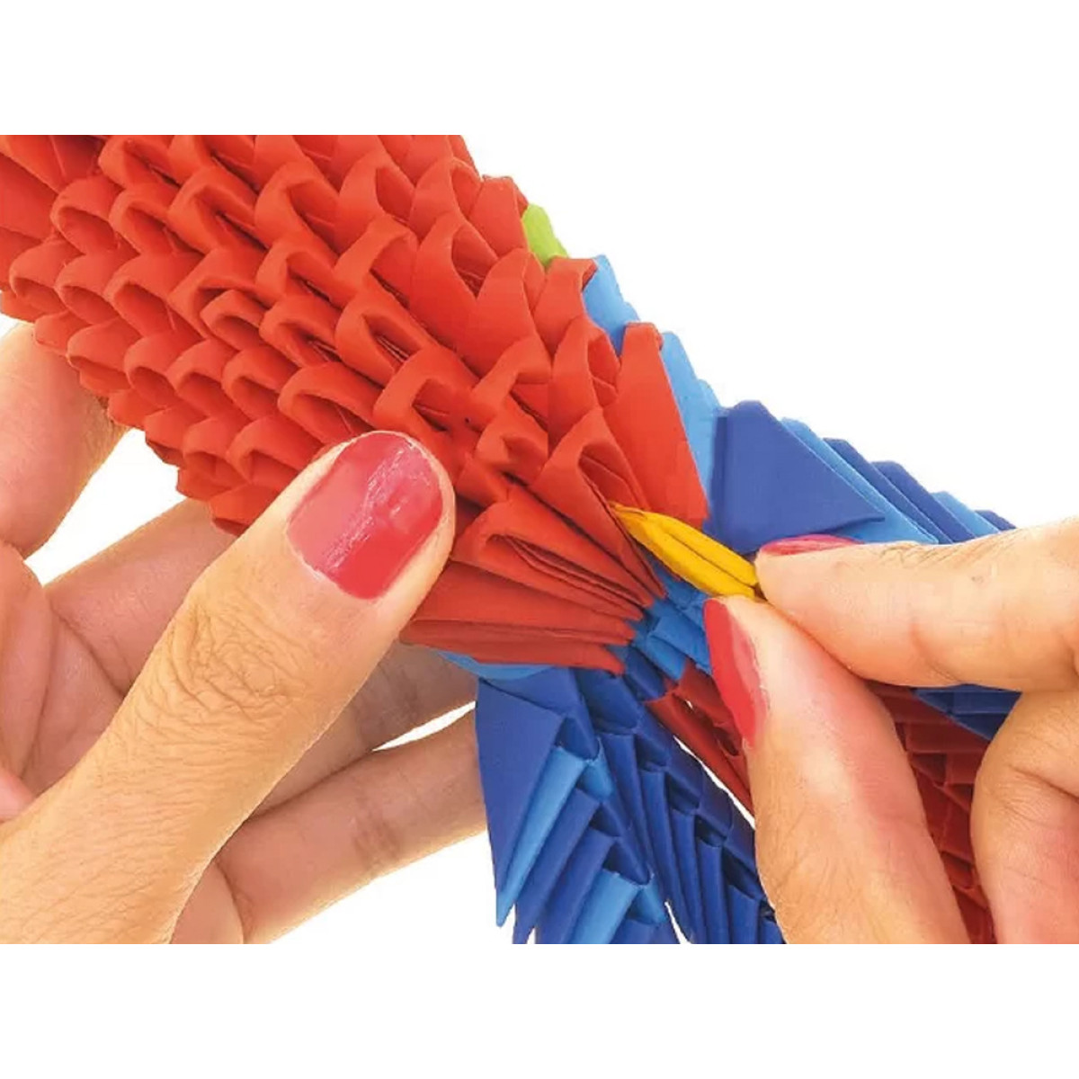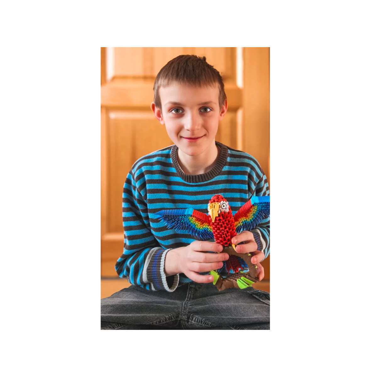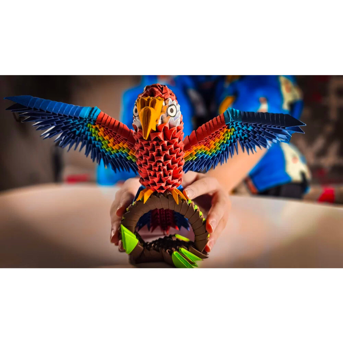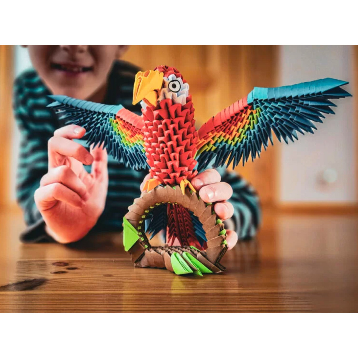 Origami 3D serija yra apdovanoti rinkiniai unikalių popierinių skulptūrų kūrimui. Dėl patentuotos formos su ryškiai išspausta lenkimo linija, trimis paprastais žingsniais sukursite pagrindinį modulį, iš kurio atsiras jūsų spalvinga papūga. Visi moduliai yra identiški ir juos jungiate be klijų, sukurdami realistišką figūrą.
