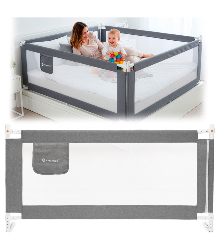 Margas 160 cm ilgio saugos barjeras yra universalus ir apsaugantis sprendimas vaikams. Jį galima sulankstyti, o pilka spalva tinka bet kokiam miegamojo interjerui. Šis barjeras pagamintas iš nerūdijančio plieno, tvirto nailono ir kietos plastiko dalių derinio, todėl jis yra puikus lovos apsaugos sprendimas. 210D Oxford audinys užtikrina patvarią, tačiau kvėpuojančią barjerą, leidžiančią orui cirkuliuoti ir užtikrinančią patogų miegą.