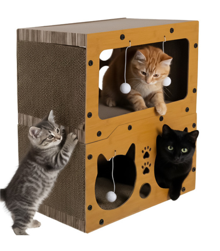 Natūrali HDF paviršiaus medžiaga efektyviai skatina draskyti, apsaugodama Jūsų baldus nuo sugadinimo. 30% tankesnė HDF plokštė nei MDF užtikrina stabilumą ir atsparumą įdubimams net esant dviem žaidžiantiems katėms. Dviaukštis namelis – du kartus daugiau komforto ir erdvės. Keturios kamuoliukai – kasdienis instinkto treniravimas: daugiau judėjimo, mažiau nuobodulio. Saugus katėms, draugiškas aplinkai – pagamintas iš ekologiškos medžiagos, be toksinų, dažų ir aštrių briaunų. Estetiškas dizainas, tinkantis bet kokiam interjerui. Paprastas surinkimas be įrankių ir streso.