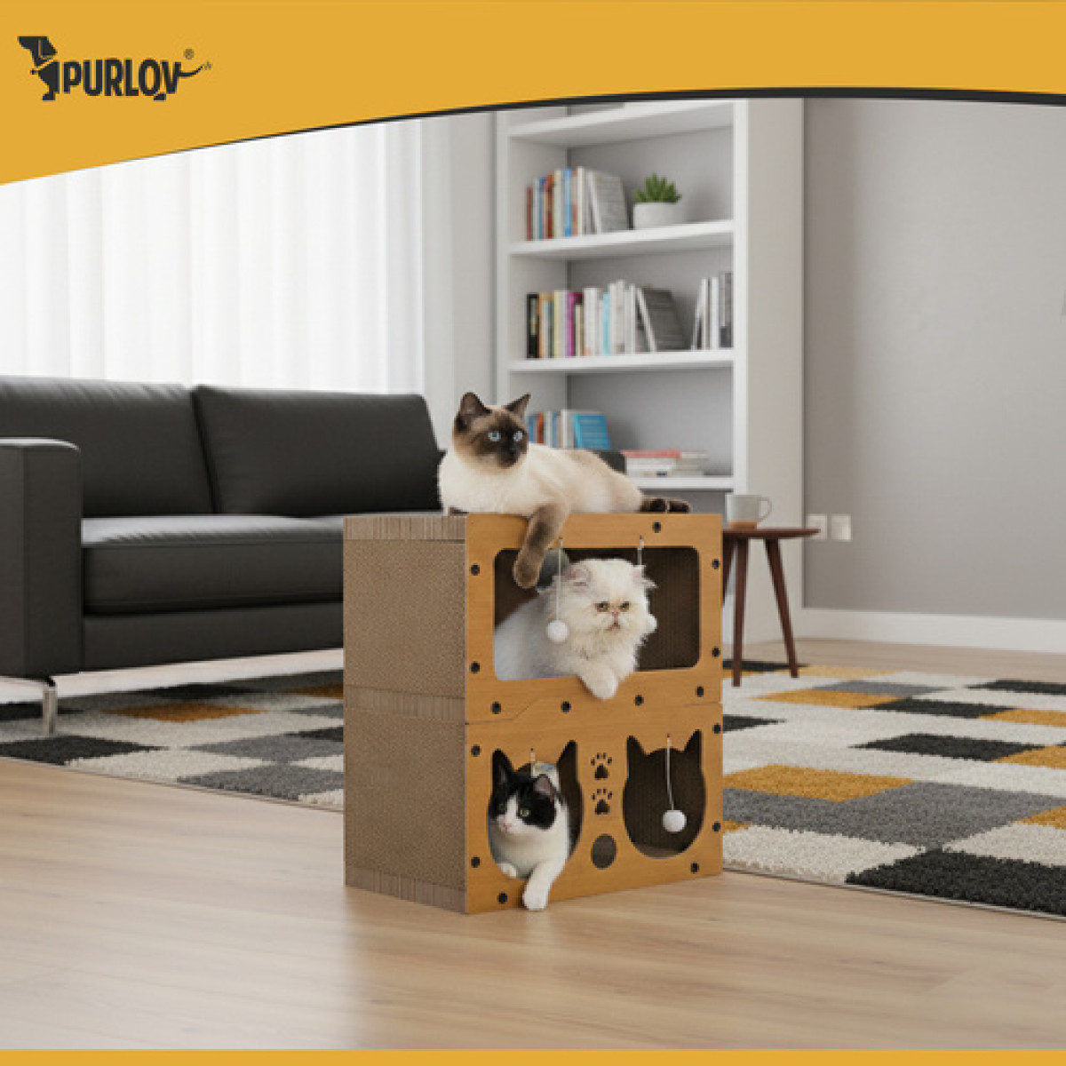 Dviaukštis kačių draskiklis su nameliu 3in1 Purlov – tai elegancijos, patvarumo ir kačių pramogos derinys. HDF plokštės suteikia stabilumo ir saugumo, o 4 kamuoliukai užtikrina kasdienę judėjimo ir žaidimo dozę. Natūrali, kieta paviršiaus medžiaga skatina draskymą, todėl Jūsų baldai bus apsaugoti, o Jūsų augintinis turės mėgstamą vietą atsipūsti ir žaisti.