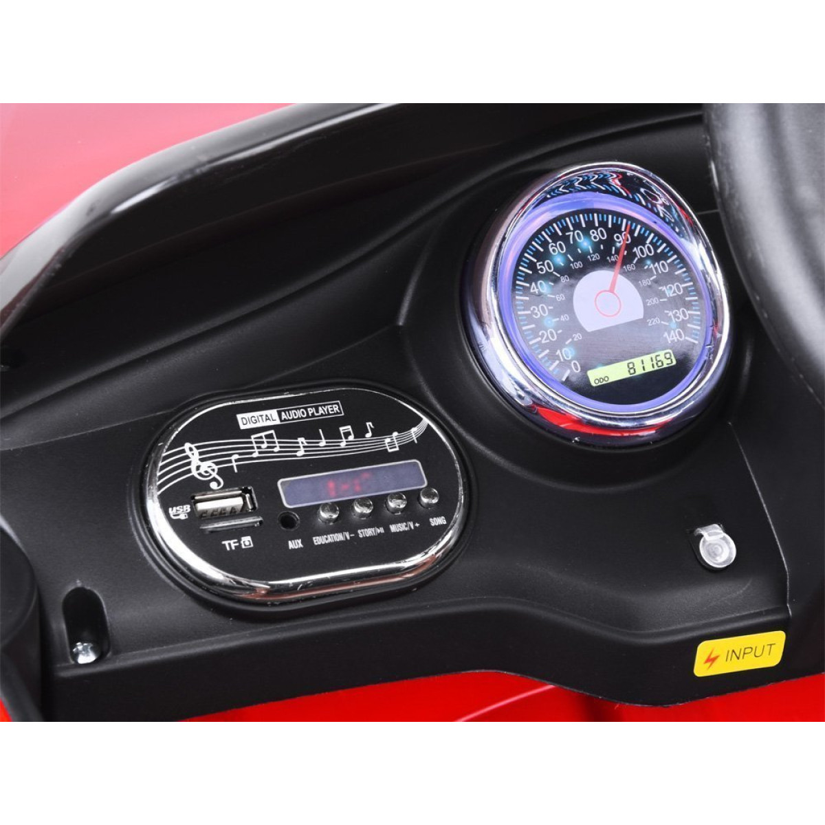 Automobilis turi muzikos valdymo skydelį su iš anksto įrašytomis melodijomis, USB jungtimi, mini SD kortele ir MP3. Vaikas gali klausytis mėgstamų dainų ar pasakų važiuodamas. Automobilio vairas turi klaksono ir melodijų mygtukus.