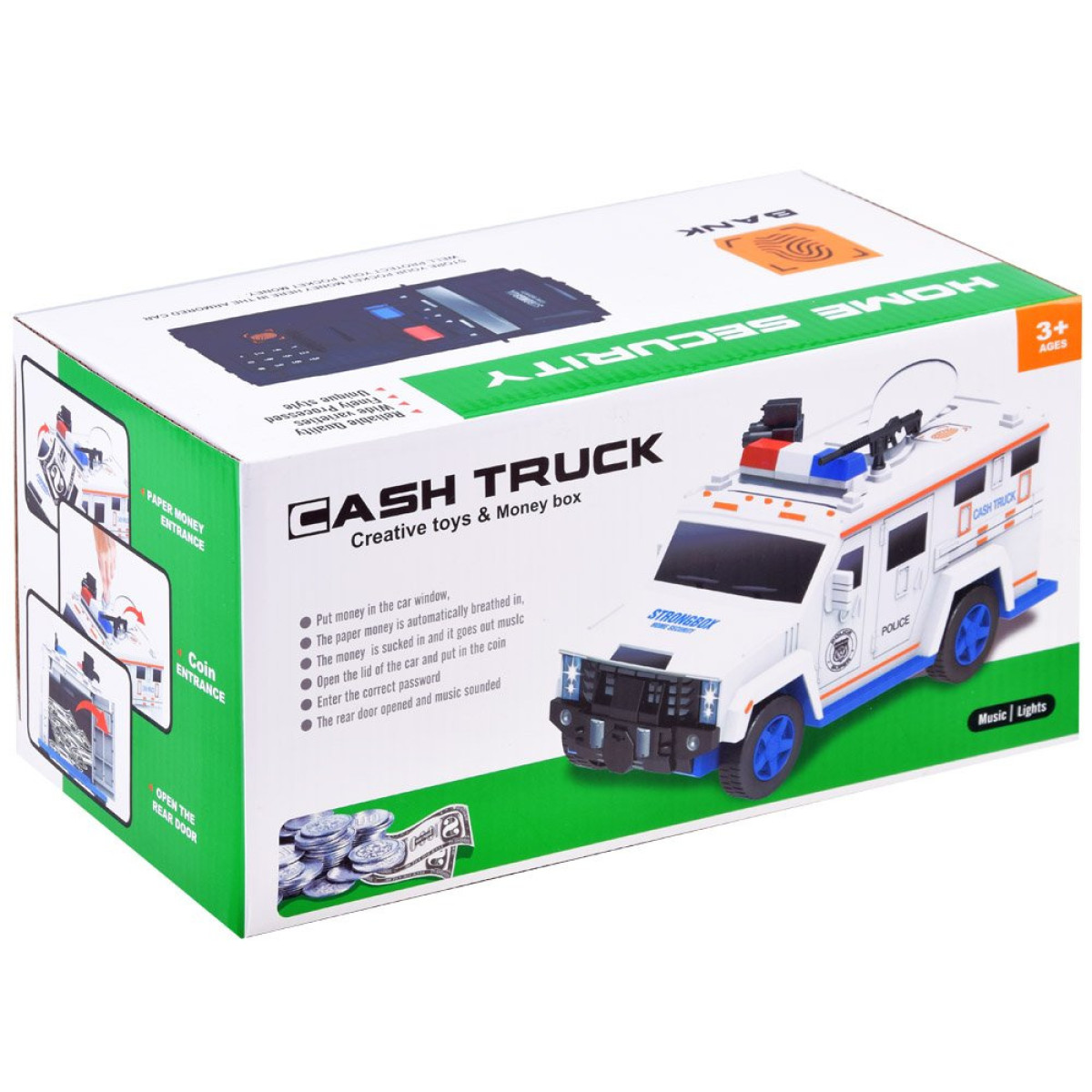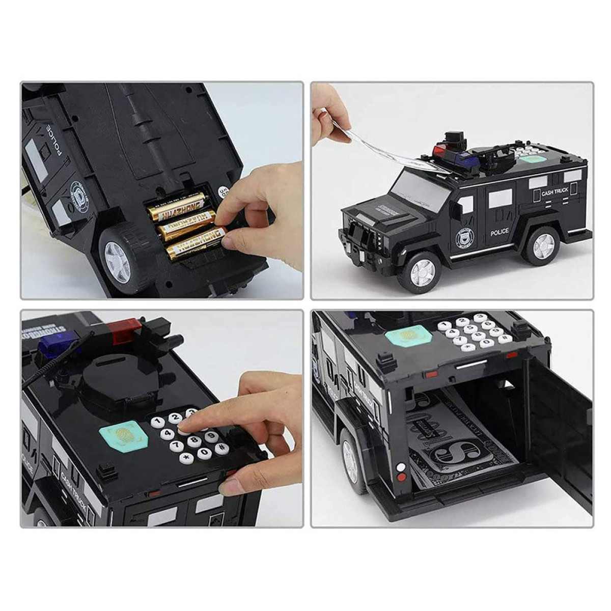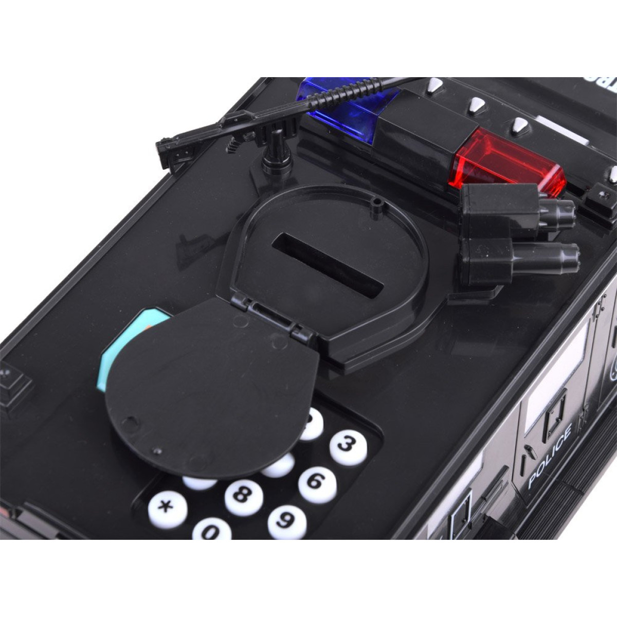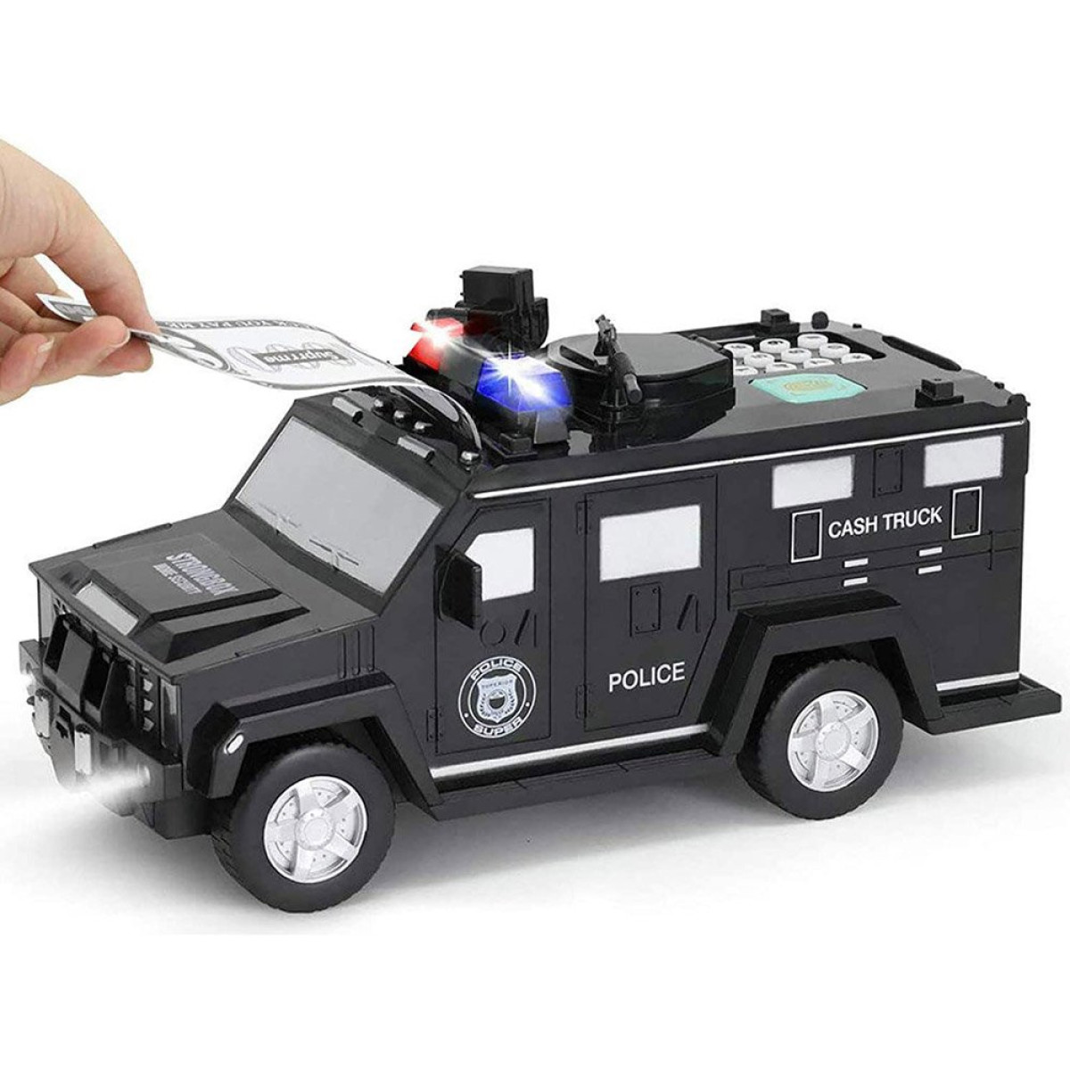 Šis policijos automobilis taupyklė yra skirta specialioms užduotims. Su garso efektais ir prieigos kodu, šis automobilis puikiai saugo ir saugo vaiko taupomas lėšas.