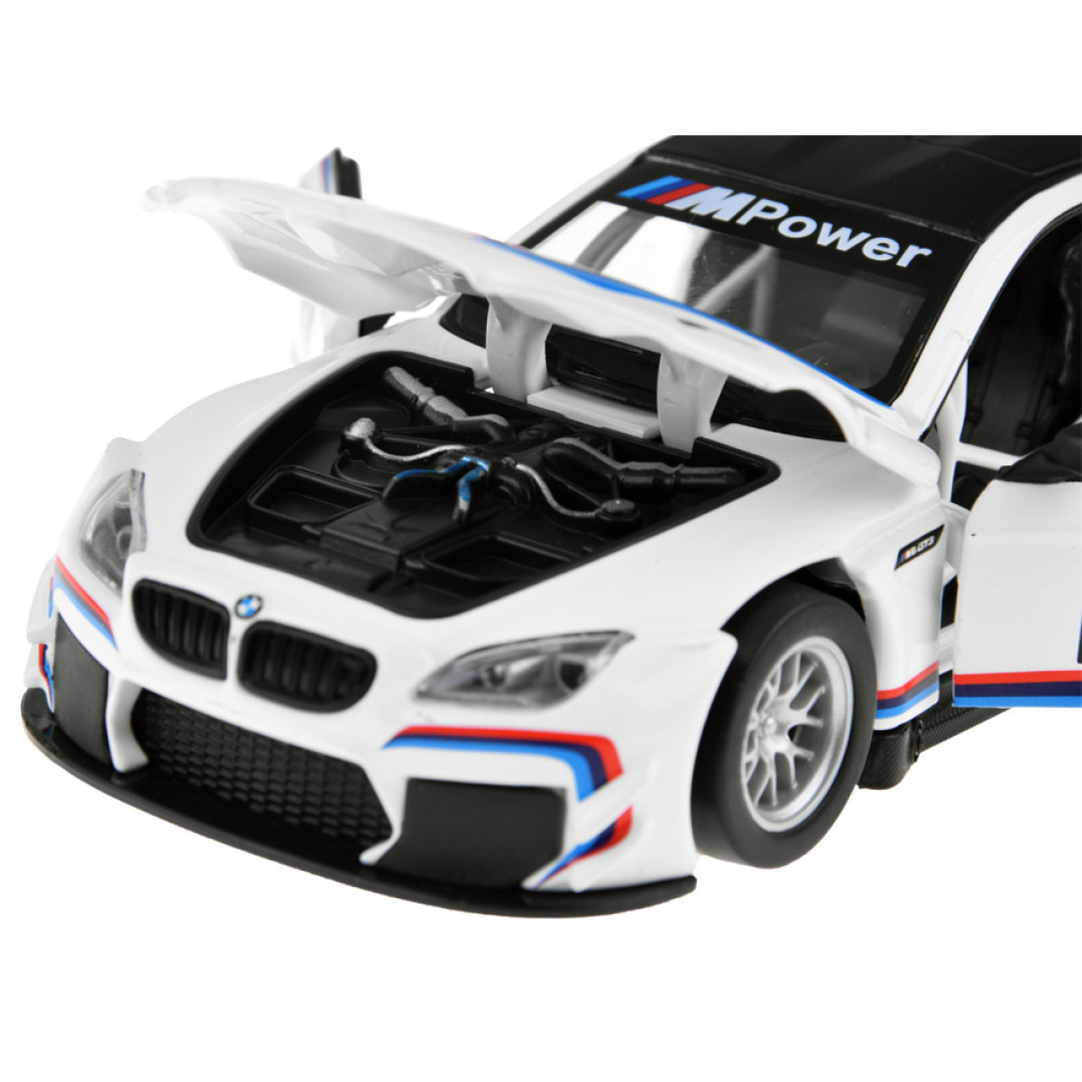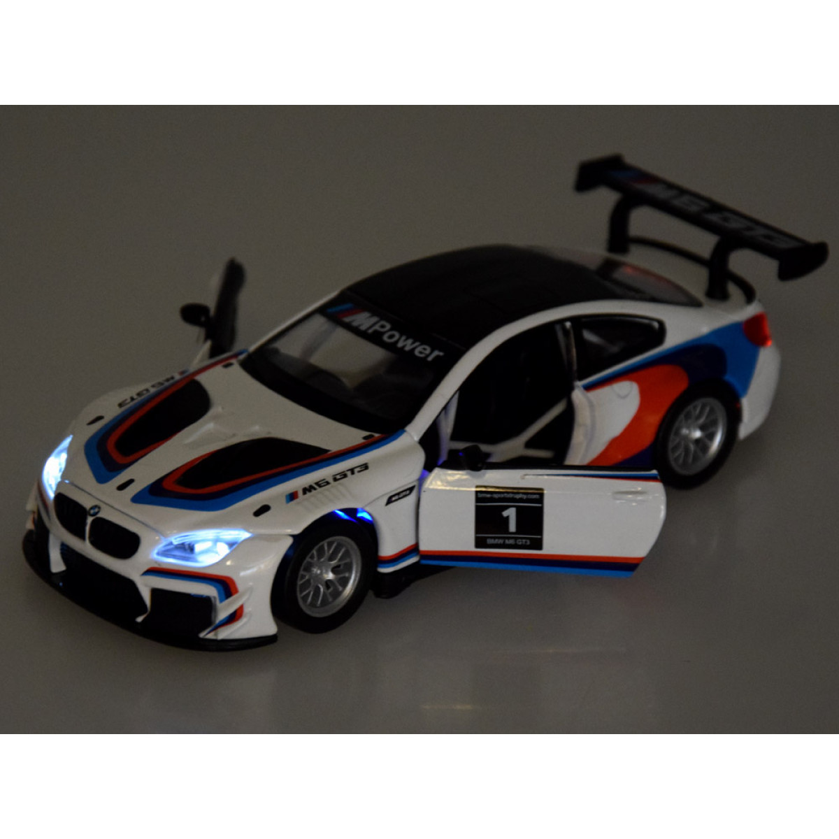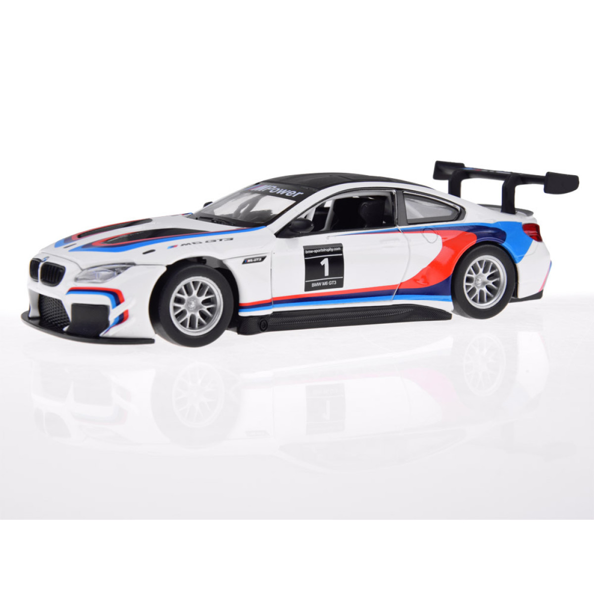 BMW M6 GT3 modelis masteliu 1:32 bus puikus priedas automobilių modelių kolekcijai. Sportinis automobilis yra labai kruopščiai ir estetiškai pagamintas, atkreipiant dėmesį į mažiausias detales, kas be abejo sužavės kiekvieną mažą vairuotoją. Automobilis turi atsidarančias duris, taip pat garso ir šviesos efektus. BMW turi friction power tipo variklį, tai reiškia, kad atsilenkus atgal ant lygios, tvirtos paviršiaus, automobilis važiuos į priekį. Automobilis taip pat veikia stumiamas.