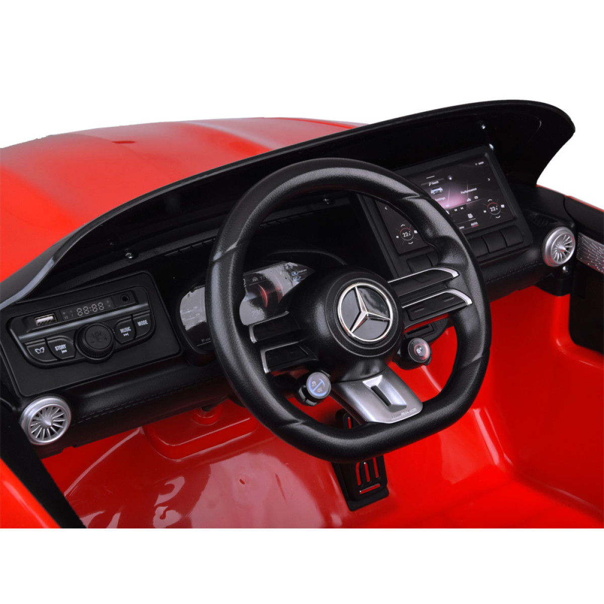 Automobilis užvedamas mygtuku, o paleidimo metu girdimas variklio užvedimo garsas, kuris sustiprina tikro automobilio įspūdį. Vaikas taip pat gali mėgautis papildomomis pramogomis, nes modelyje įrengtas muzikos skydelis su įrašytomis melodijomis, pasakojimais anglų kalba, radiju, usb ir mp3 jungtimis. Taip galima klausytis ir mėgstamos savo muzikos.