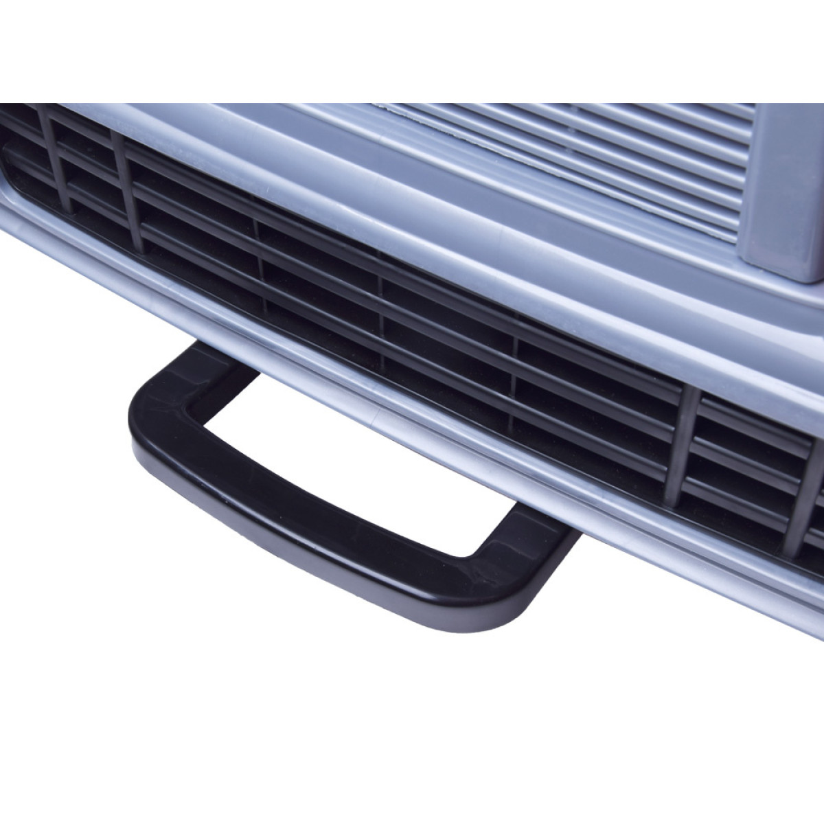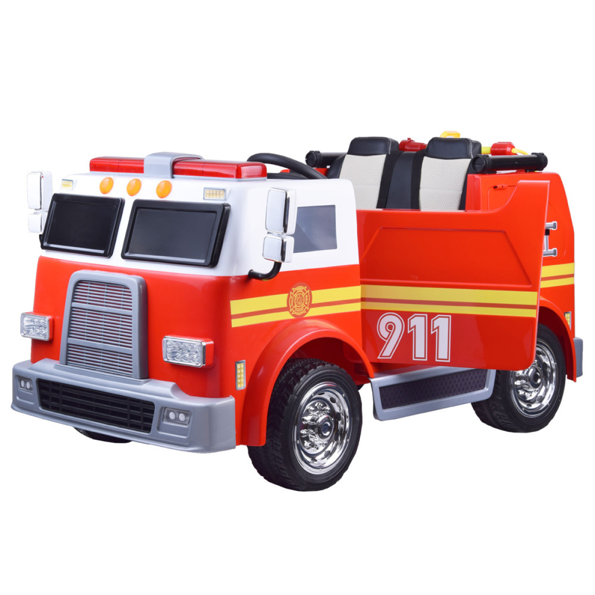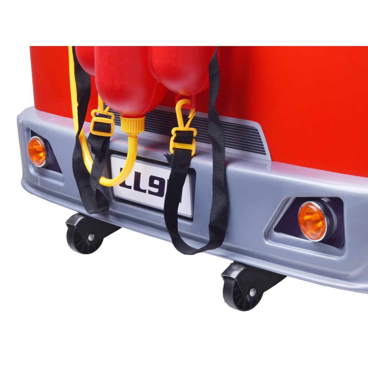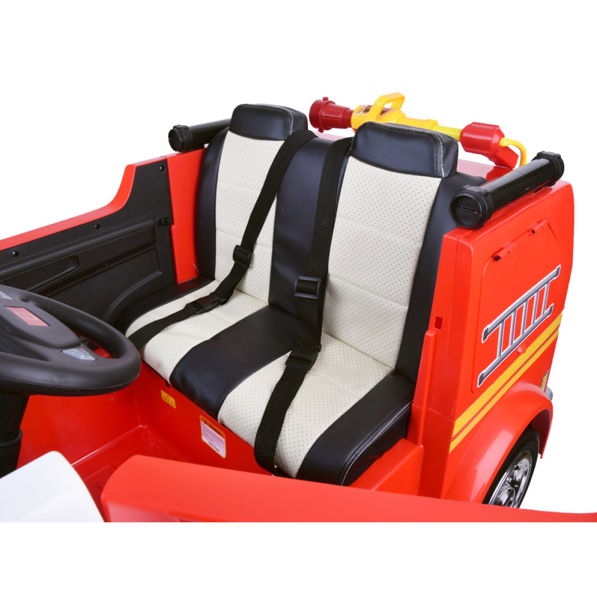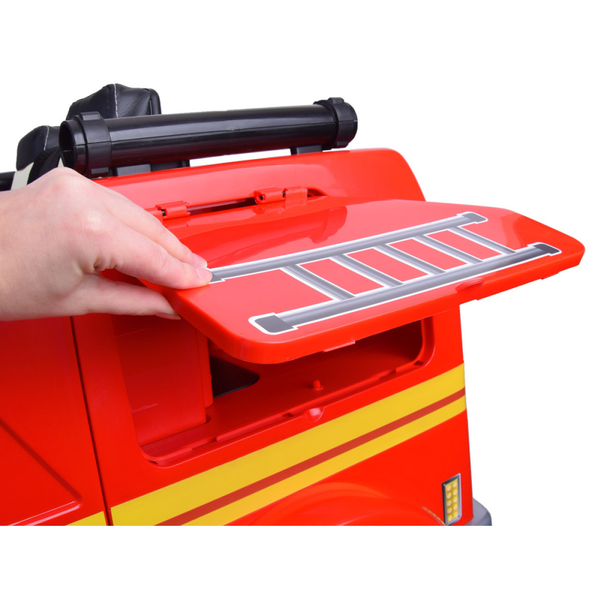 Vaikiškas gaisrinės automobilis turi patogią, plačią ekologinės odos sėdynę su saugos diržais ir 3 padėčių sėdynės reguliavimą. Gale pritvirtinta vandens patranka, kuri dar labiau sustiprina žaidimo įspūdį. Priekyje yra rankena, skirta patogiau tempti automobilį, o gale įrengti maži paslepiami ratukai.