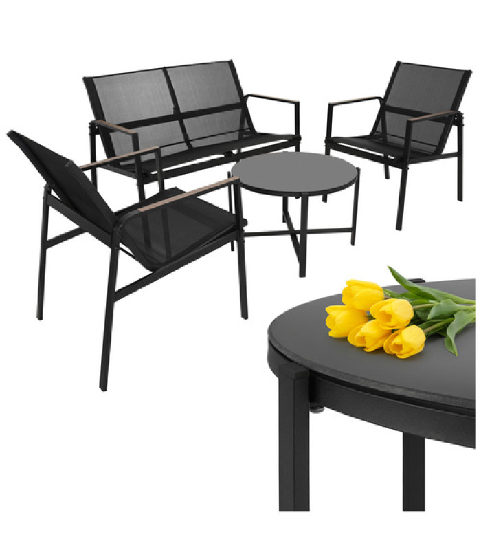 Balkoninis baldų komplektas Gardlov - puikus pasirinkimas norintiems patogiai ilsėtis balkone ar terasoje. Komplektas sudarytas iš stalo, dviejų kėdžių ir sofos, kurio nereikia sudėtingai valyti, nes nėra apmušalų. Stabilus plieninis rėmas ir orui pralaidi teslino medžiaga užtikrina komfortą ir ilgaamžiškumą.