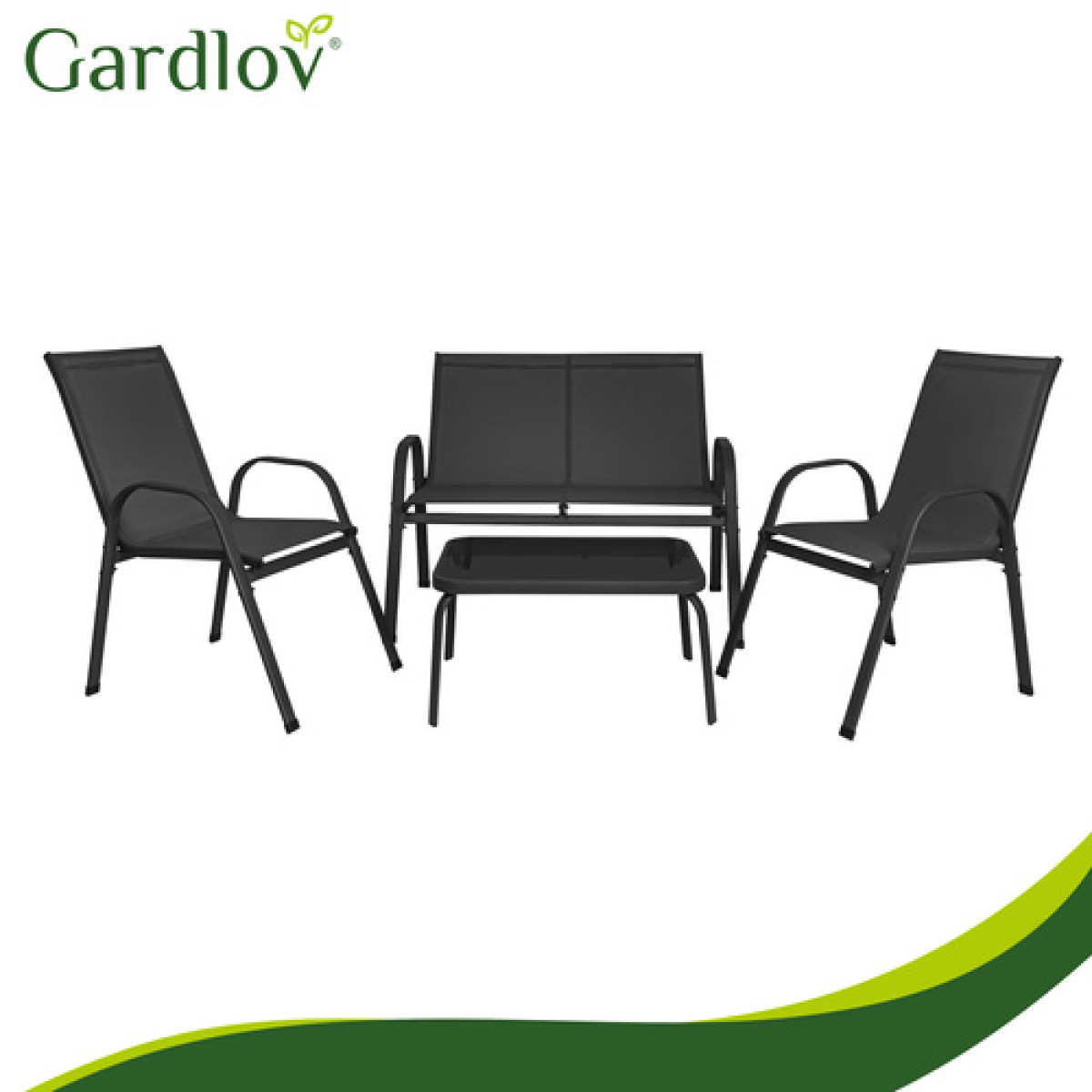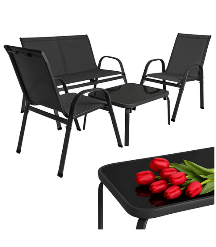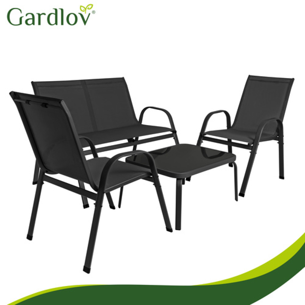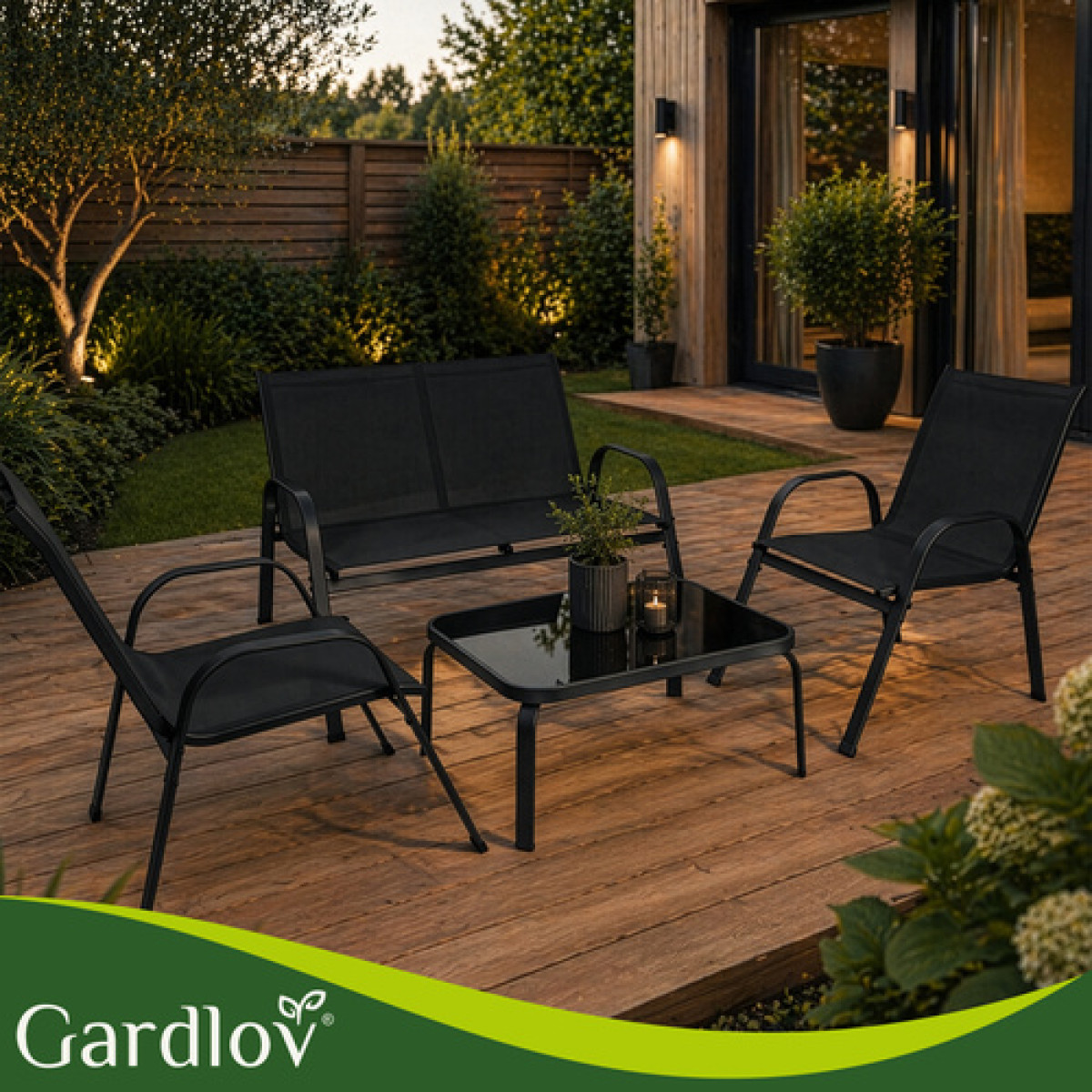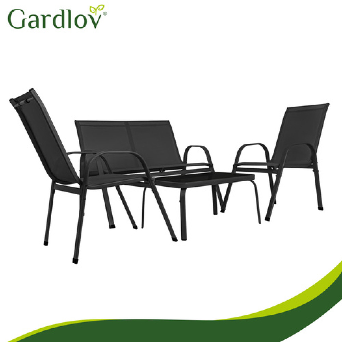 gardlov balkono ir sodo baldų komplektas yra stilingas ir patogus pasirinkimas jaukiai poilsio zonai lauke. Komplektą sudaro dvivietė sofa, du foteliai ir staliukas su grūdinto stiklo stalviršiu, todėl jis puikiai tinka 4 asmenims. Juodos spalvos baldai lengvai dera prie įvairaus balkono, terasos ar sodo aplinkos.