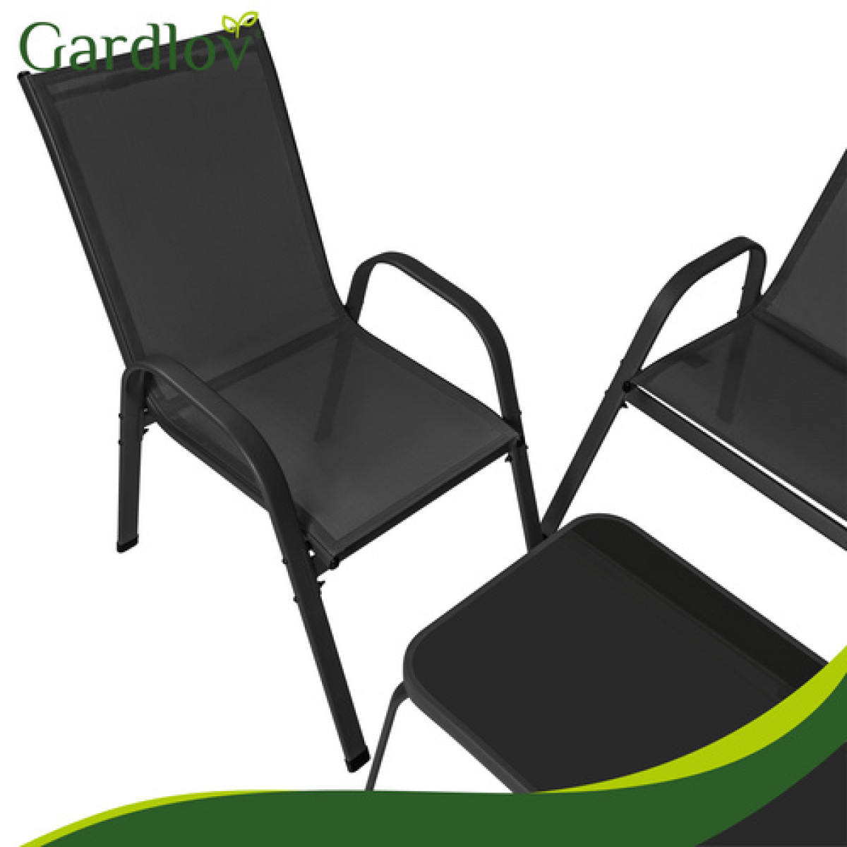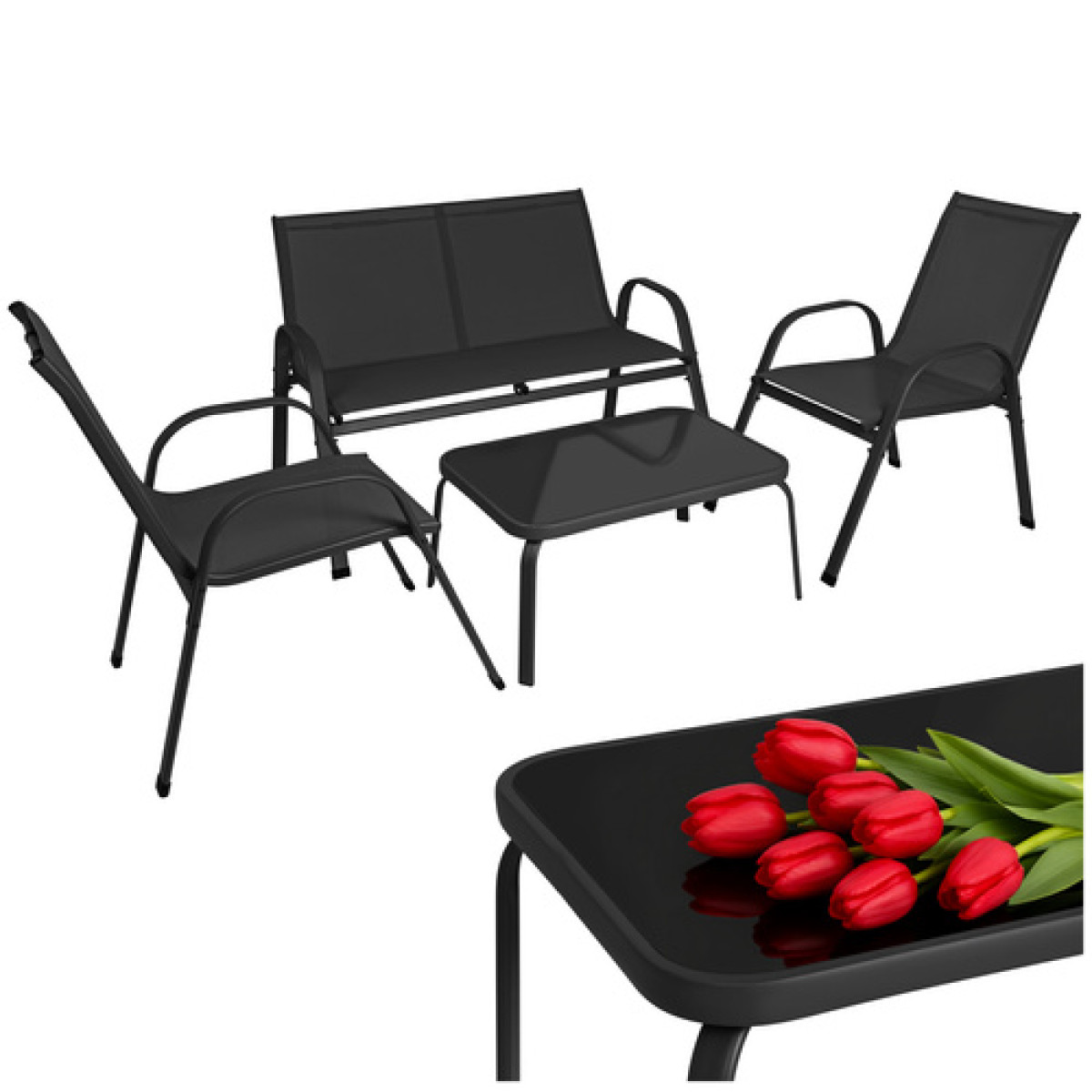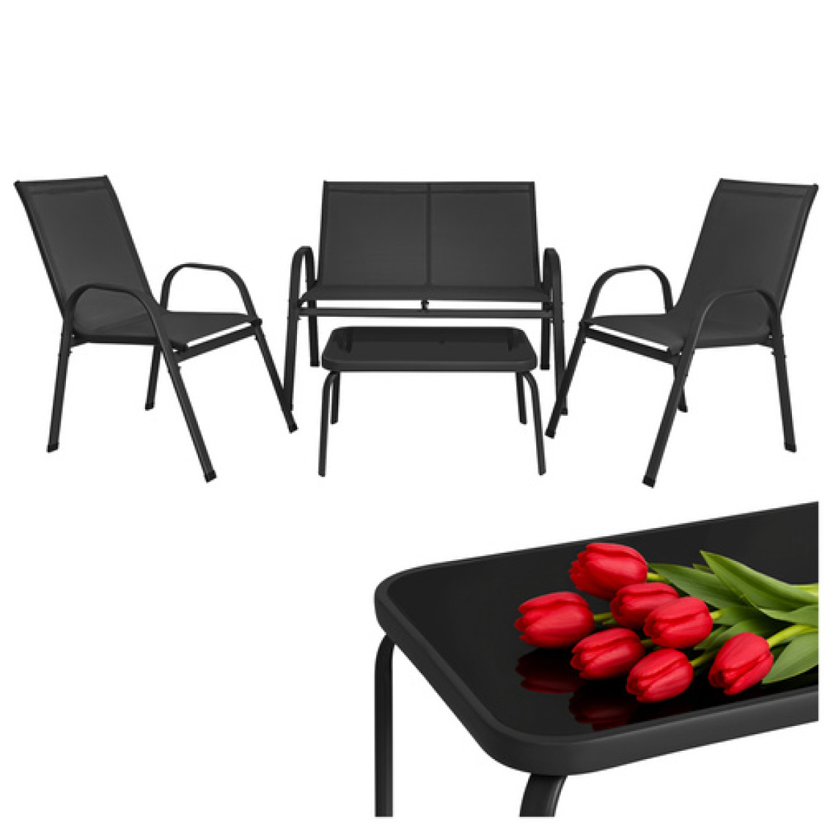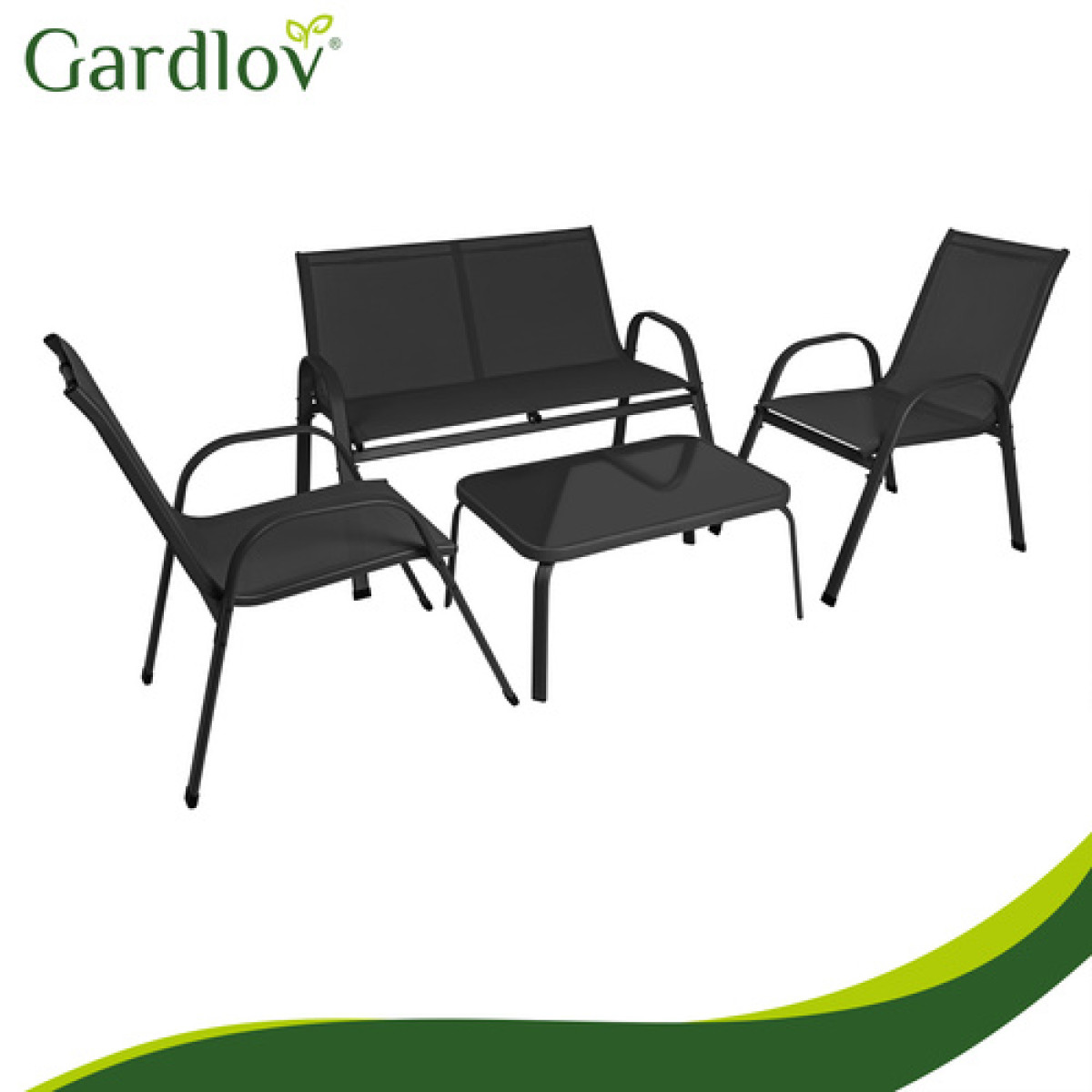 gardlov balkono ir sodo baldų komplektas yra stilingas ir patogus pasirinkimas jaukiai poilsio zonai lauke. Komplektą sudaro dvivietė sofa, du foteliai ir staliukas su grūdinto stiklo stalviršiu, todėl jis puikiai tinka 4 asmenims. Juodos spalvos baldai lengvai dera prie įvairaus balkono, terasos ar sodo aplinkos.