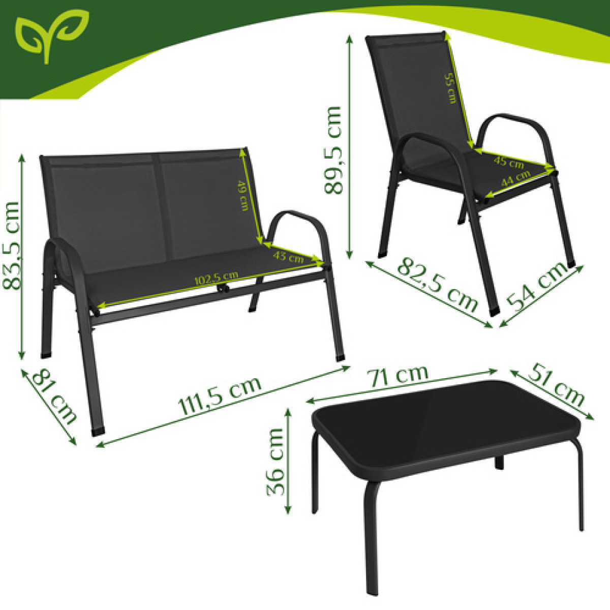 Lengvas derinimas: juoda spalva atrodo moderniai ir lengvai priderinama prie kitų lauko baldų bei dekoro.