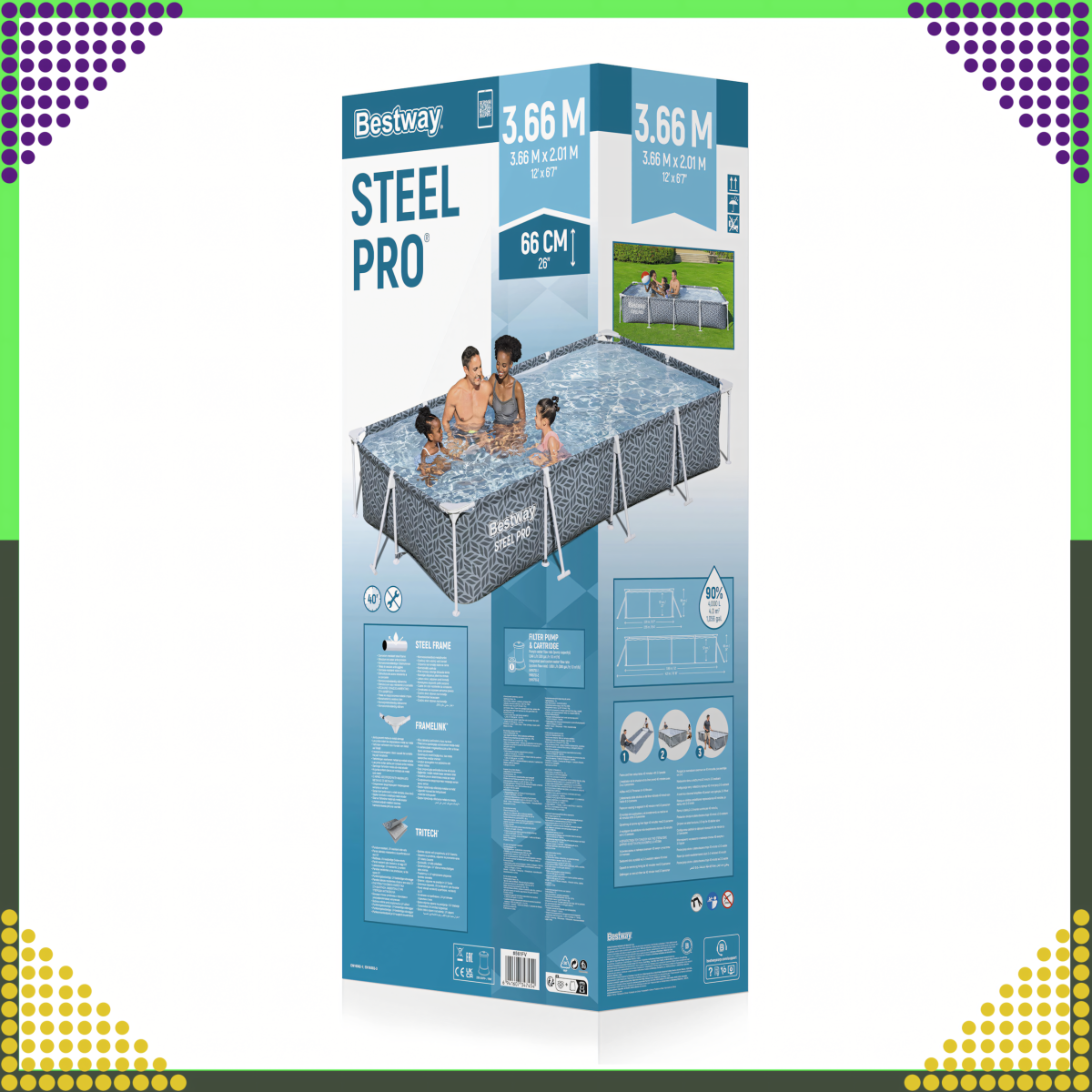 Šis stačiakampis sodo baseinas yra puikus pasirinkimas tiems, kurie nori mėgautis vasaros malonumais savo kieme. Baseinas yra pagamintas iš aukštos kokybės plieno, kas užtikrina ilgaamžiškumą ir patikimumą. Jo dydis 366x201x66 cm leidžia patogiai tilpti šeimai ar draugų kompanijai.