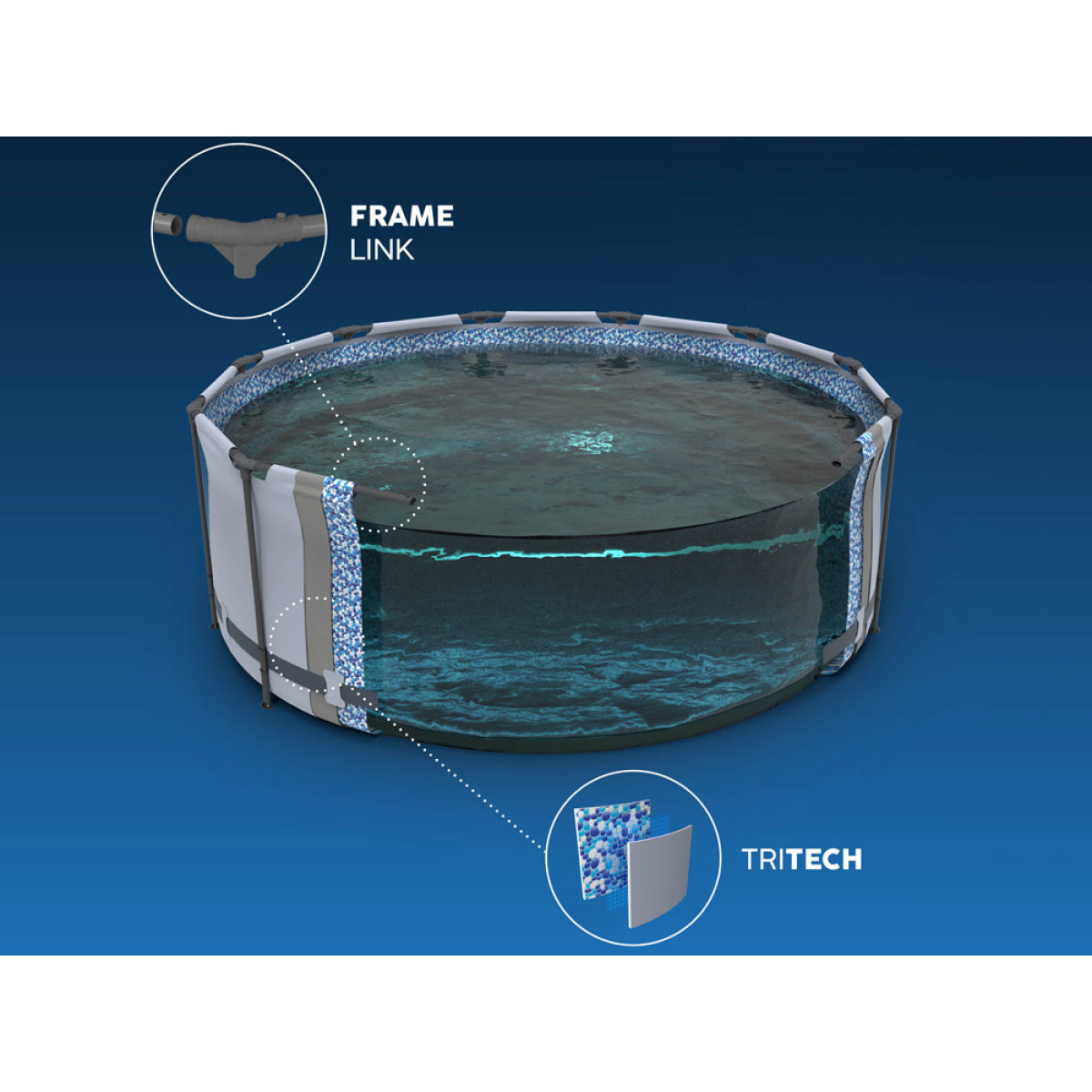 Baseino savybės: Trisluoksnės, labai tvirtos šoninės sienos iš PVC ir poliesterio. Aukščiausios kokybės, korozijai atspari cinkuota plieninė rėmas užtikrina baseino stabilumą. Apvalios formos baseinas leidžia lengvai sumontuoti, užtikrina didesnį stabilumą ir mažiau iššvaistytos erdvės. Montavimas be įrankių! Šiuolaikinės technologijos užtikrina ilgaamžiškumą.