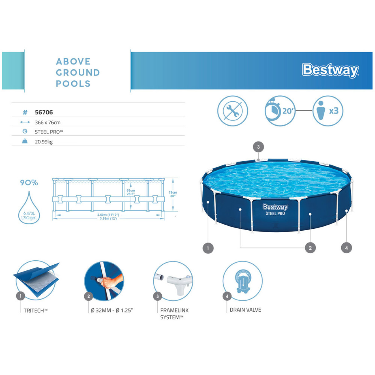 Steel Pro™ karkasas pagamintas iš metalo, atsparaus nepalankioms oro sąlygoms. FrameLink System™ - specialiai suformuotos jungtys apsaugo nuo korozijos metalo sujungimuose. Nauja TRITECH™ medžiaga su poliesterio tinklelio šerdimi ir dviem storomis PVC sluoksniais užtikrina baseino ilgaamžiškumą.