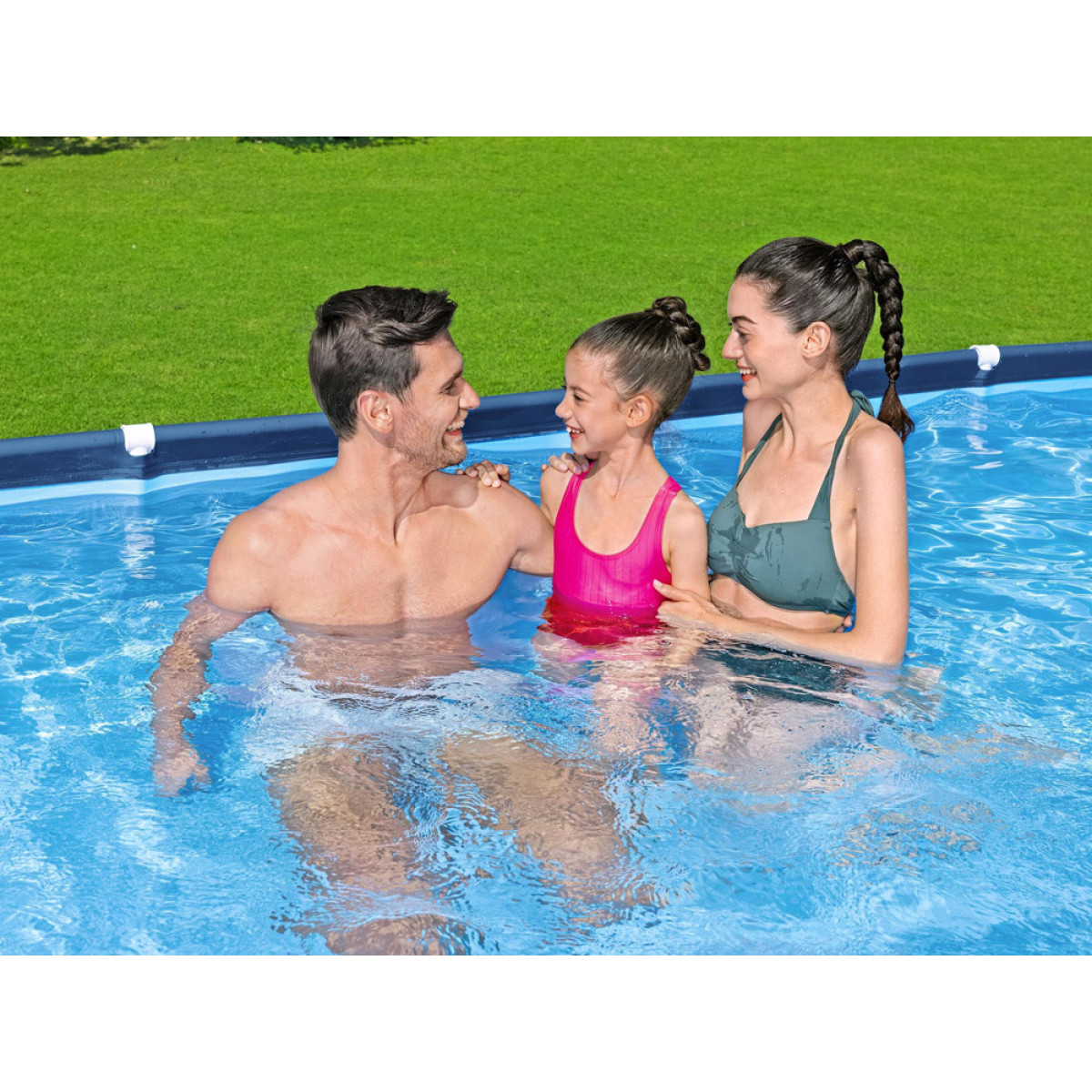 Jeigu karštą dieną norite atsigaivinti, bet nenorite vykti į perpildytą baseiną ar paplūdimį, šis baseinas yra sukurtas būtent jums. Rektanguliari forma leidžia laisvai judėti, maksimaliai taupant vietą sode ar terasoje. Baseiną labai lengva ir greita sumontuoti. Korozijai atsparus metalinis karkasas užtikrina puikų konstrukcijos stabilumą. Šio sezono naujovė – ultramodernus DURAPLUS medžiaga, kuri sustiprinta poliesterio tinklelio šerdimi ir dviem storomis PVC sluoksniais, užtikrinančiais puikų tvirtumą ir ilgaamžiškumą. Greitam vandens išleidimui skirtos specialios vožtuvai. Vandens filtravimą užtikrina pompa su 1,249 l/h našumu, todėl vanduo išliks švarus ilgiau.