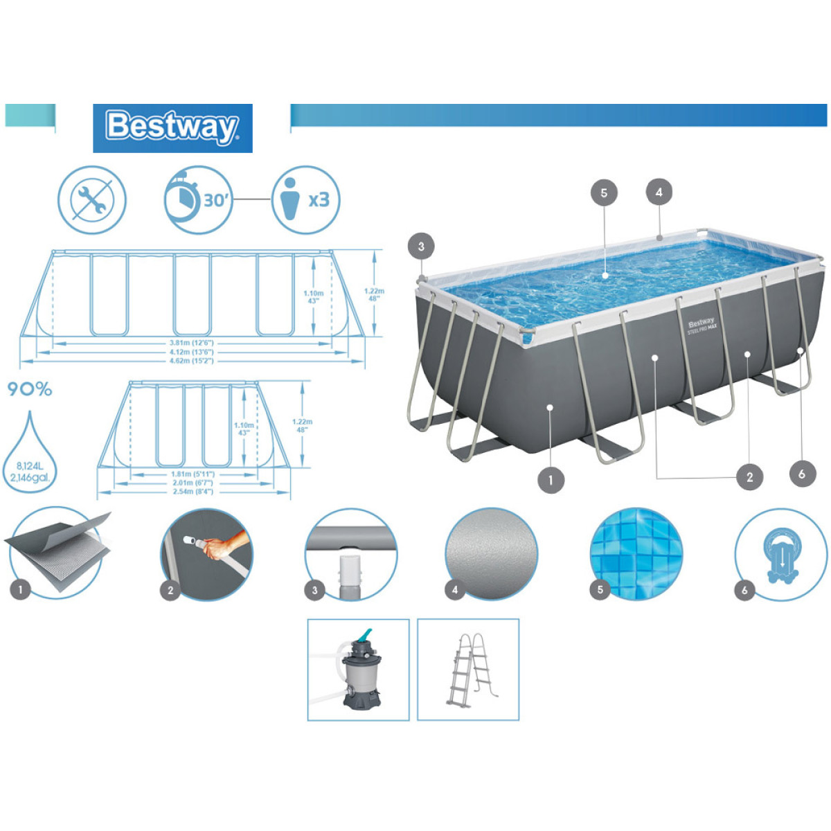 Baseinas Bestway Power Steel (412 x 201 x 122 cm) su 8 124 litrų talpa užtikrina komfortišką atvėsinimą karštomis dienomis. Šio baseino dydis ir gylis leidžia tiek vaikams, tiek suaugusiems jaustis patogiai. Baseinas pagamintas iš metalinės konstrukcijos, kuri atspari lietui ir kintančioms oro sąlygoms. Jis padengtas trijų sluoksnių Tritech medžiaga, kuri užtikrina ilgaamžiškumą.