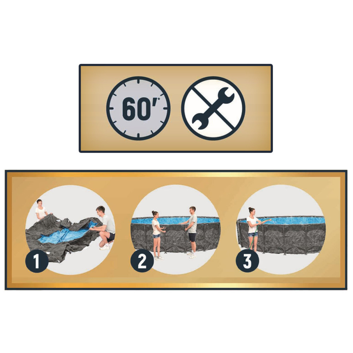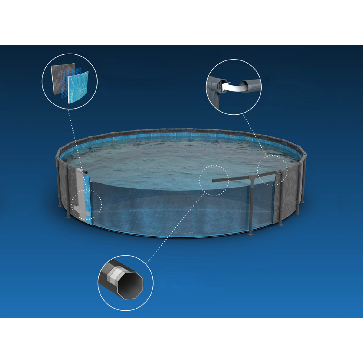 Baseino rėmas pagamintas iš cinkuoto plieno, kuris apsaugo nuo rūdžių ir pažeidimų. Naudojama ClickConnect™ sistema leidžia lengvai surinkti baseiną be įrankių pagalbos. Rėmo jungtys taip pat apsaugo nuo metalo kontakto, užtikrindamos atsparumą korozijai ir rūdims.