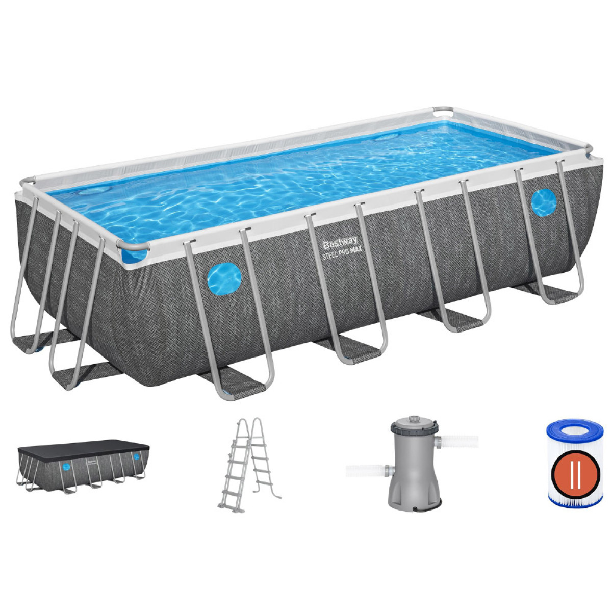 - Papildomi priedai: Už vandens švarą atsako siurblys su 3,028 l/h našumu ir pridėtu II tipo filtru (58094). Rinkinyje taip pat yra kopėčios, kurios palengvina įlipimą ir išlipimą iš baseino. Be to, kopėčių laipteliai gali būti lengvai pakelti, kad vaikai negalėtų patekti į baseiną be suaugusiųjų priežiūros.