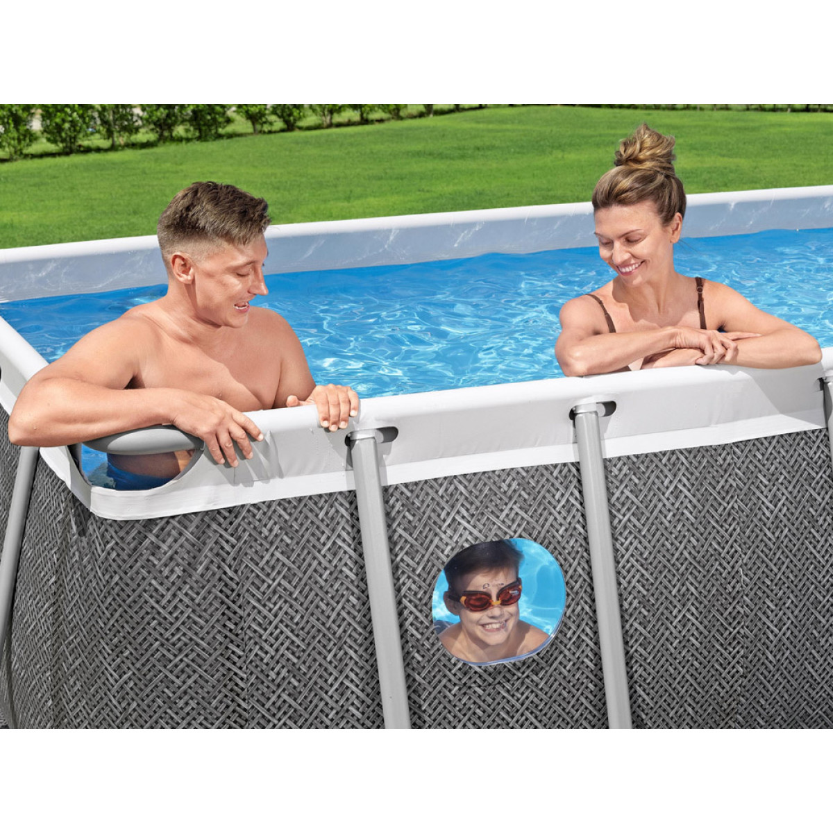 Baseinas iš serijos Splashview™ Steel Pro Max™ prekės ženklo Bestway suteikia išskirtinę patirtį. Dėl baseine įrengtų langelių plaukikai gali mojuoti sėdintiems šalia, daryti juokingas grimasas, o tėvai gali lengvai stebėti, kas vyksta baseine, be poreikio įlipti į vandenį.
