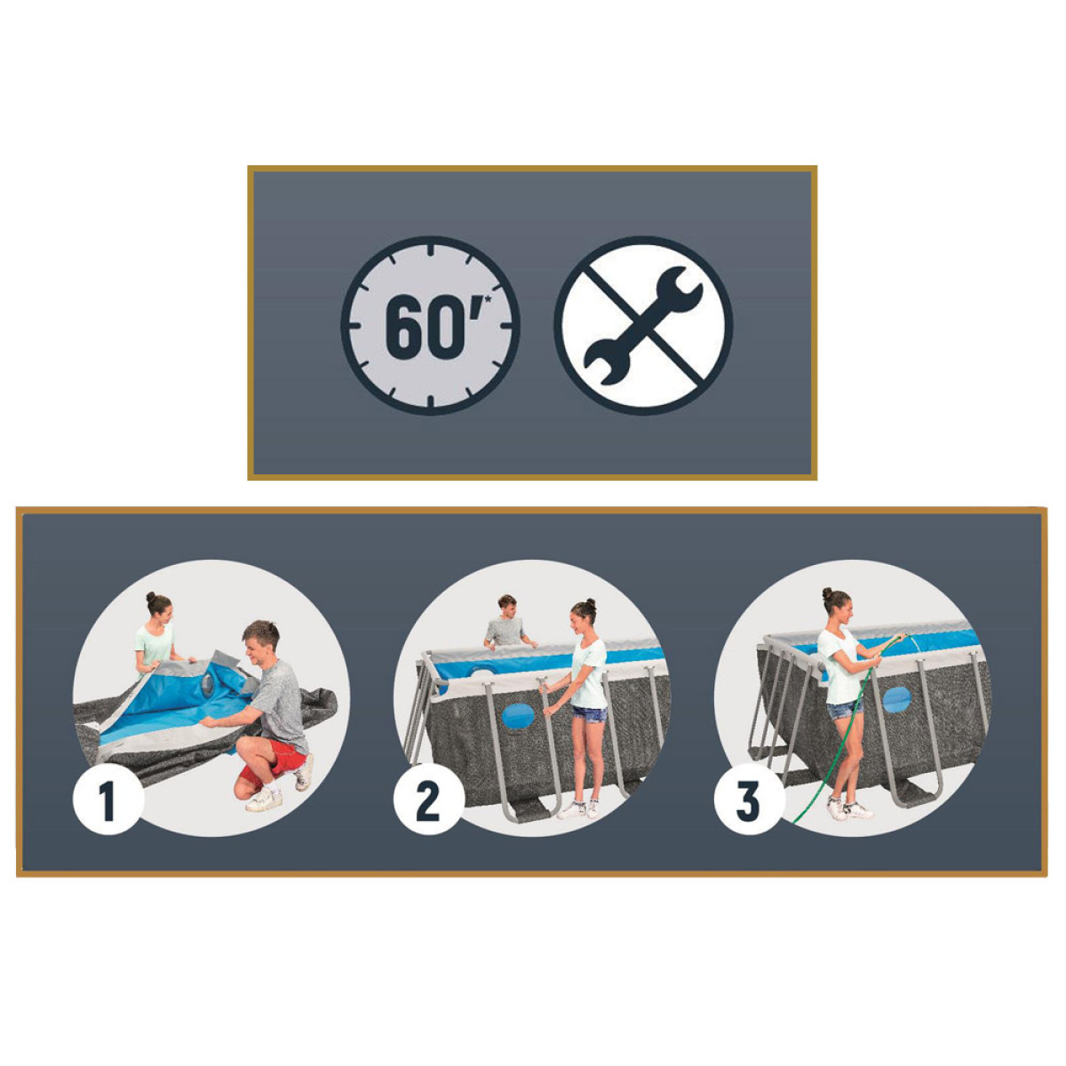 - Patvari konstrukcija: Baseino rėmas pagamintas iš aukščiausios kokybės plieno, todėl konstrukcija yra stabili ir saugi. Specialiai suformuoti jungikliai ClickConnect™ leidžia lengvai surinkti baseiną be jokių įrankių. Rėmo jungtys taip pat užtikrina atsparumą korozijai ir rūdims.