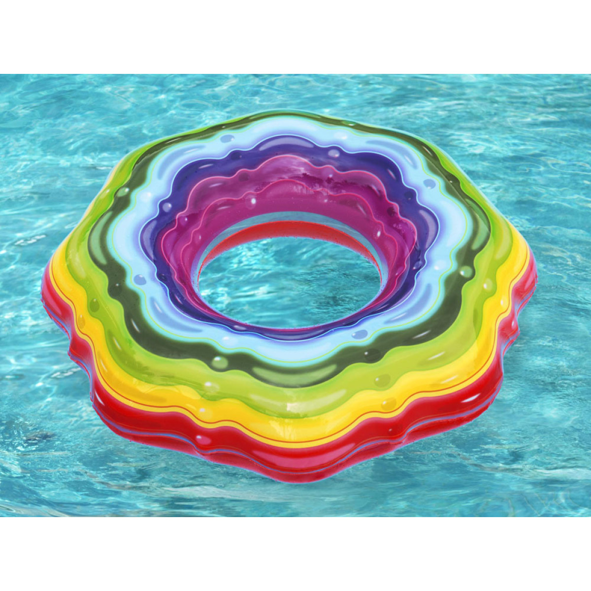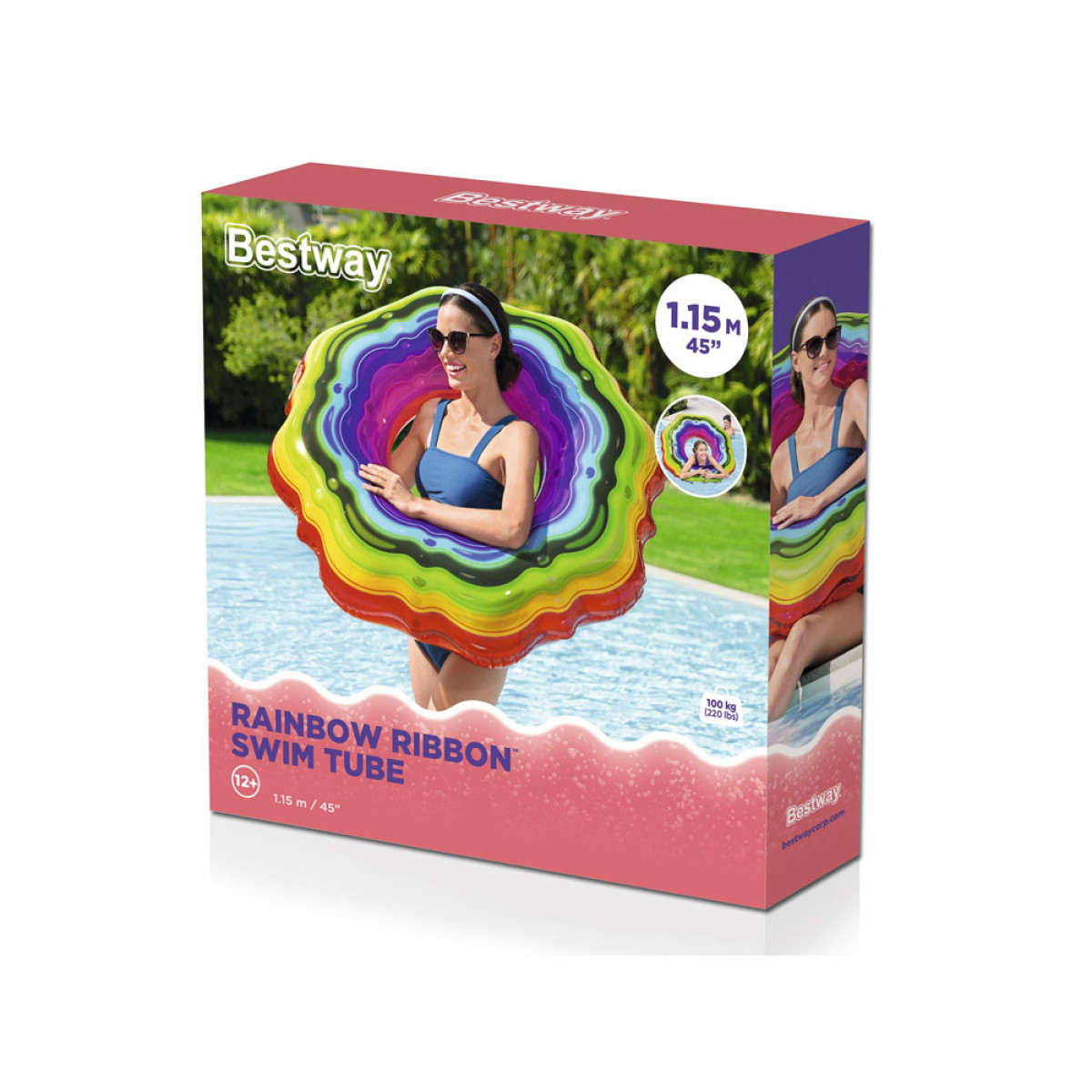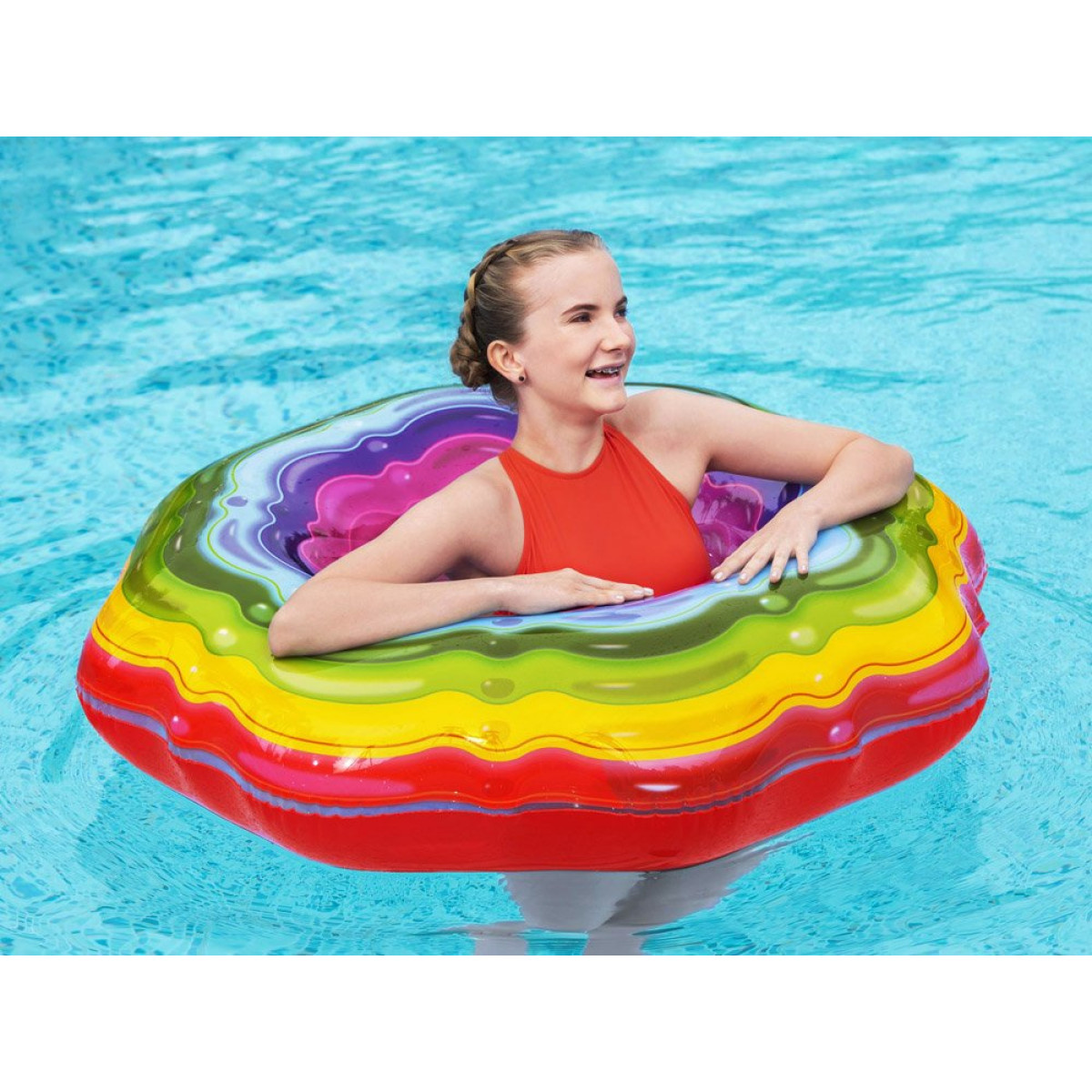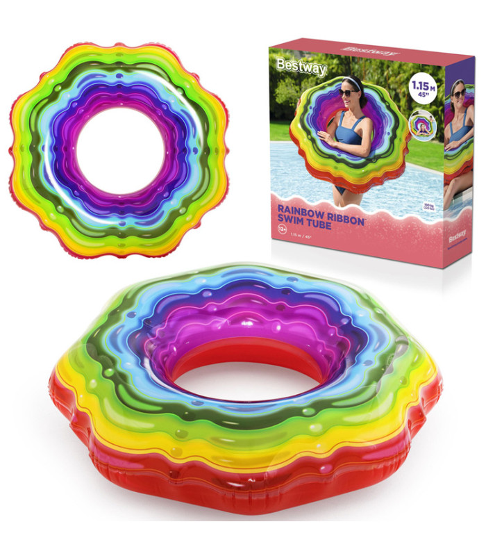 Didelis pripučiamas plaukimo žiedas, kuris primena didžiulę vaivorykštinę galaretką, yra šių metų Bestway pasiūlymas. Žiedas, kurio skersmuo yra 115 cm, pagamintas iš patvarios medžiagos, atsparios UVA spinduliams ir jūros vandeniui. Aptakus dizainas užtikrina komfortišką ir malonų poilsį prie vandens.