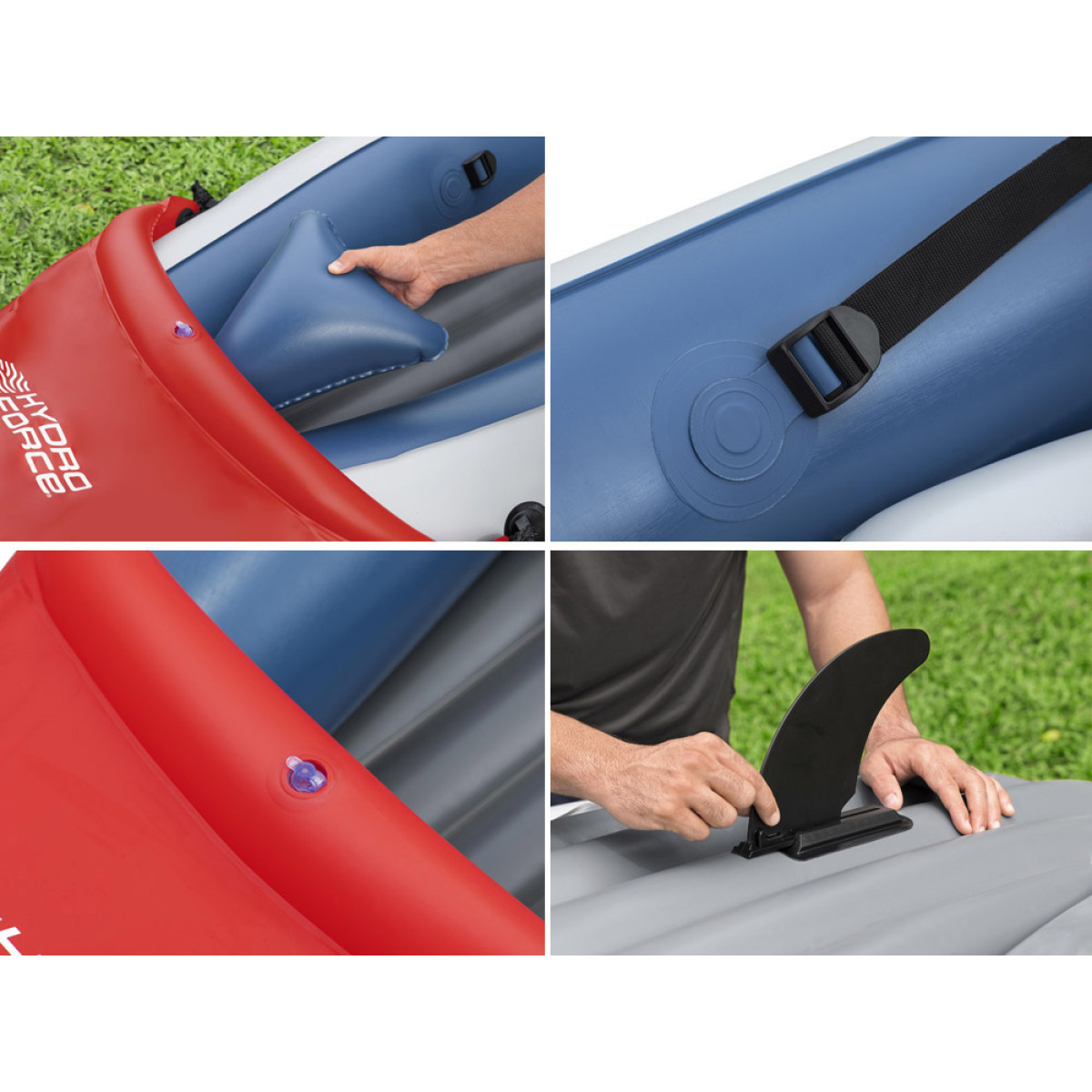 Patogumai: Kajake yra pripučiamos sėdynės su atlošais, sustiprintos diržais. Minkšta grindų konstrukcija su I-beam technologija suteikia stabilumą ir sumažina siūbavimą. Patogūs rankenos priekyje ir gale padeda lengvai nešti kajaką.
