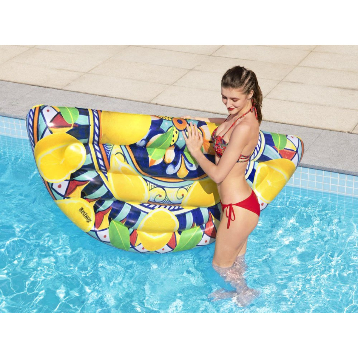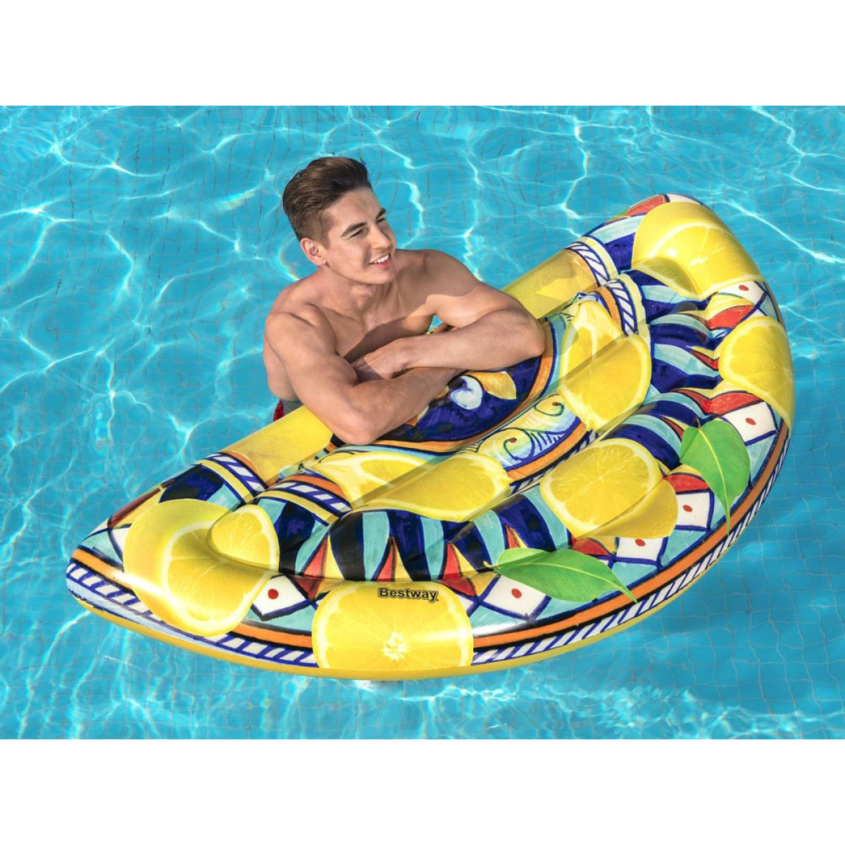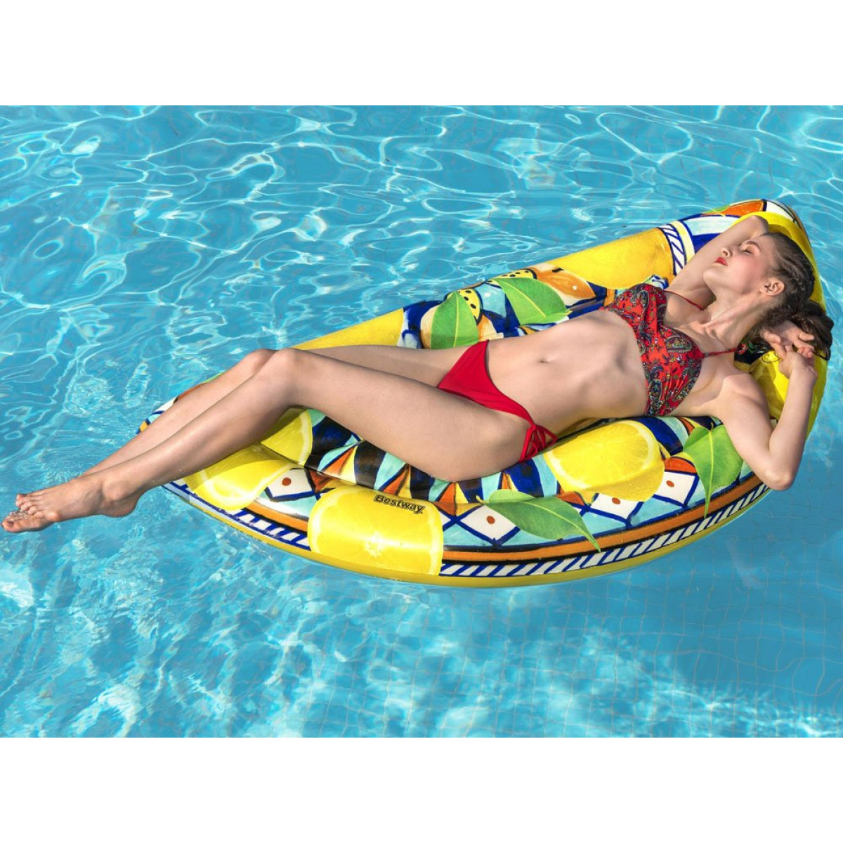 Citrininis čiužinys puikiai atrodys kiekvienoje vasaros nuotraukoje. Jo forma užtikrina patogų plaukiojimą ir malonų poilsį. Parduotuvė Jokomisiada siūlo įvairius plaukimo aksesuarus iš Bestway.