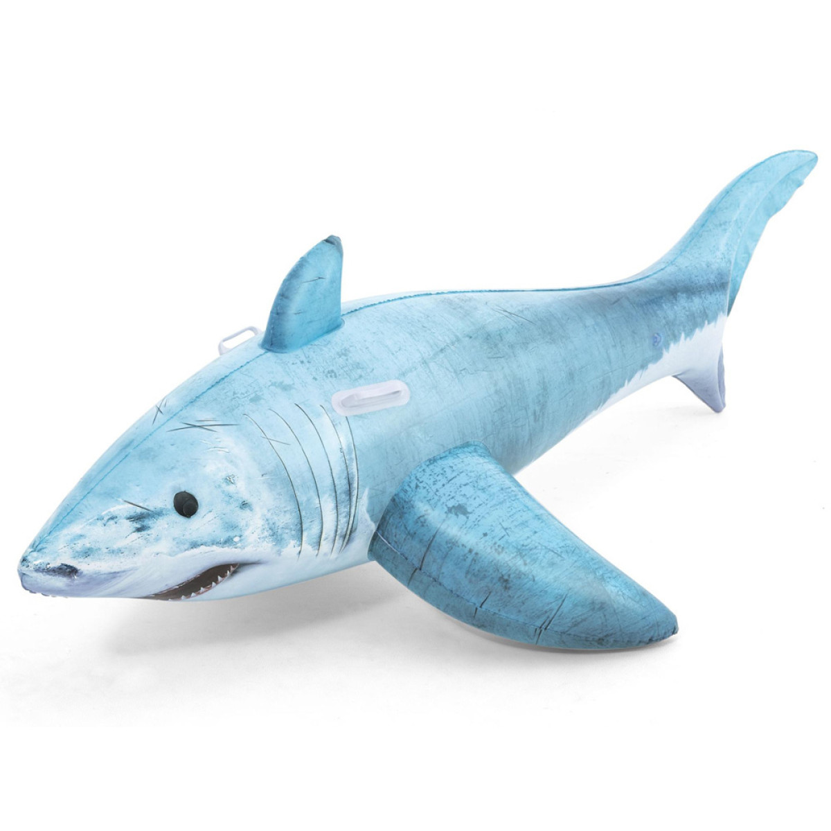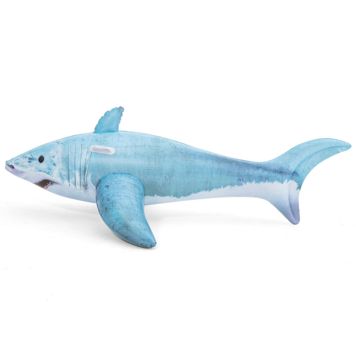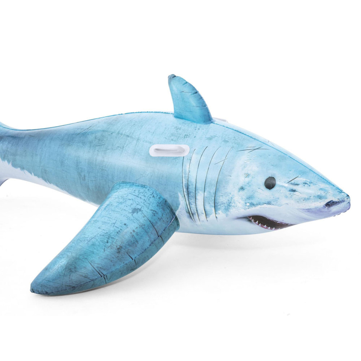 Jo neabejotinas privalumas yra labai realistiška išvaizda ir dydis 183 x 102 cm, kuris patenkins kiekvieną mažą nuotykių faną. Maksimalus apkrovimas yra 45 kg. Pagamintas iš lengvo, minkšto, bet patvaraus vinilo. Stabilus ir saugus - skirtas vaikams nuo 3 metų amžiaus. Ant nugaros yra du laikikliai, kurie leis vaikui jaustis visiškai saugiai. Laikiklius galima naudoti ir pervežant. Dydis užtikrina, kad ryklys puikiai atrodys tiek paplūdimyje, tiek baseine.