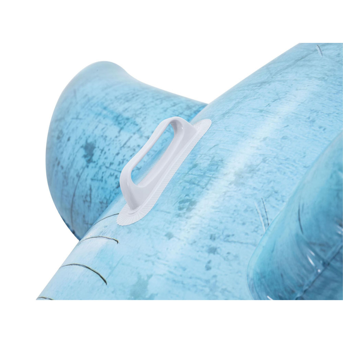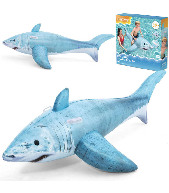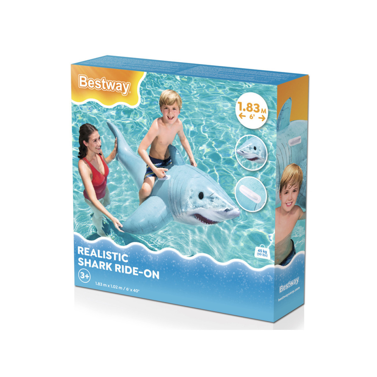 Jo neabejotinas privalumas yra labai realistiška išvaizda ir dydis 183 x 102 cm, kuris patenkins kiekvieną mažą nuotykių faną. Maksimalus apkrovimas yra 45 kg. Pagamintas iš lengvo, minkšto, bet patvaraus vinilo. Stabilus ir saugus - skirtas vaikams nuo 3 metų amžiaus. Ant nugaros yra du laikikliai, kurie leis vaikui jaustis visiškai saugiai. Laikiklius galima naudoti ir pervežant. Dydis užtikrina, kad ryklys puikiai atrodys tiek paplūdimyje, tiek baseine.