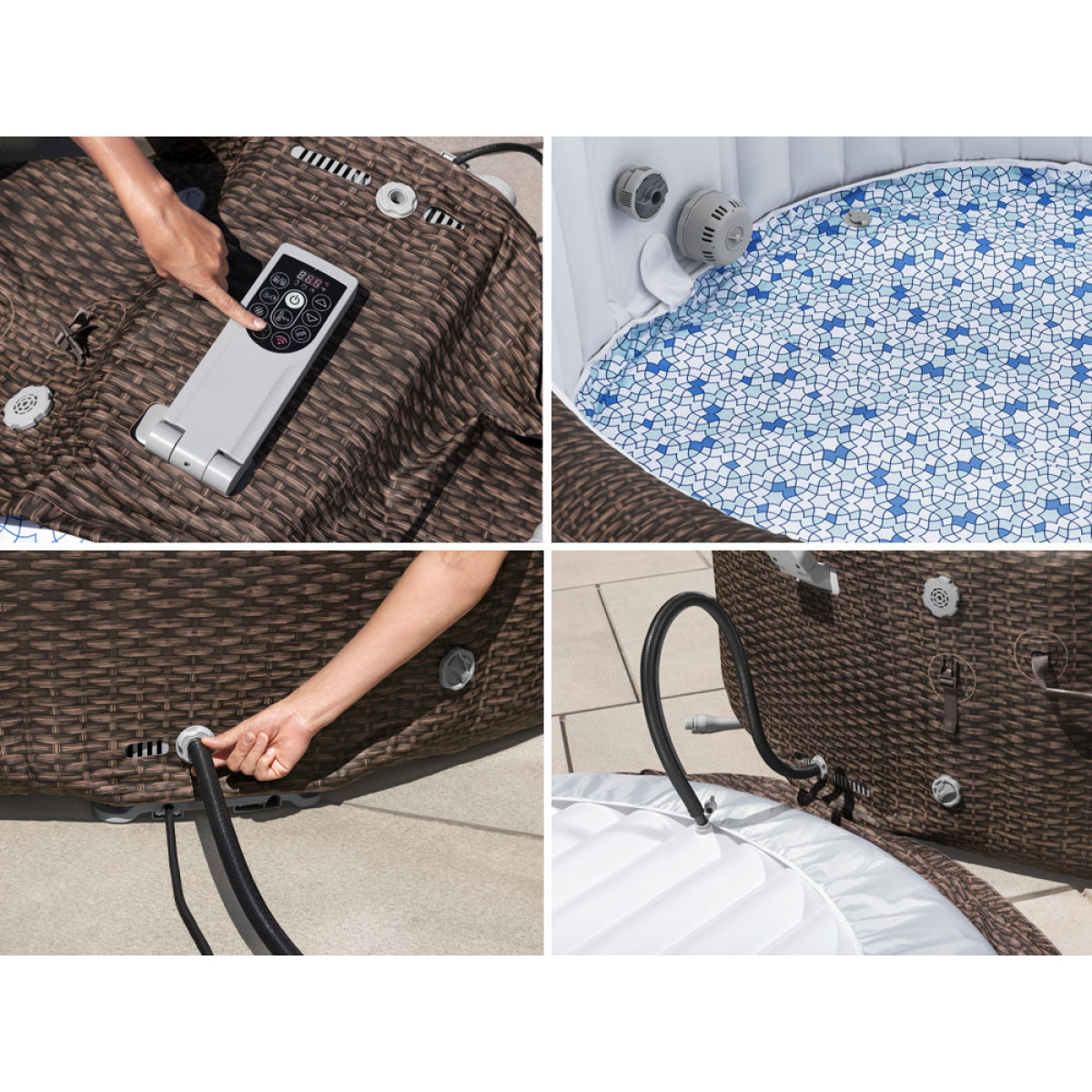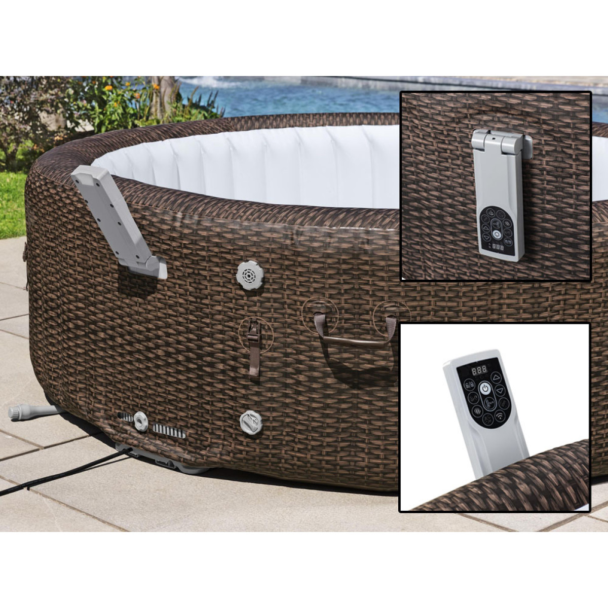Išorinis rudos rotango imitacijos raštas atrodo moderniai ir estetiškai. Tamsiai ruda spalva puikiai derės su terasa ar sodu, pridėdamas įdomų elementą poilsio zonai. Vidinis mozaikos dizainas mėlynos spalvos atspalviais sustiprins krištolo skaidrumo vandens efektą.