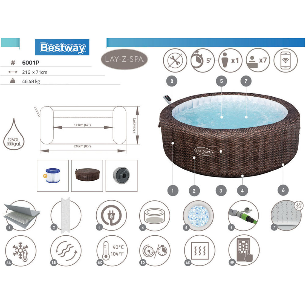 Šiuo spa galima valdyti iš mobiliojo įrenginio naudojant Bestway SmartSpa™ aplikaciją. Ši inovacija daro Bali Smart AirJet 7 vienu iš patogiausių spa rinkoje. Aplikacija leidžia nustatyti idealų spa temperatūrą, aktyvuoti energijos taupymo laikmatį, įjungti vandens filtrą ir valdyti masažo sistemą – viską galite valdyti savo rankose!