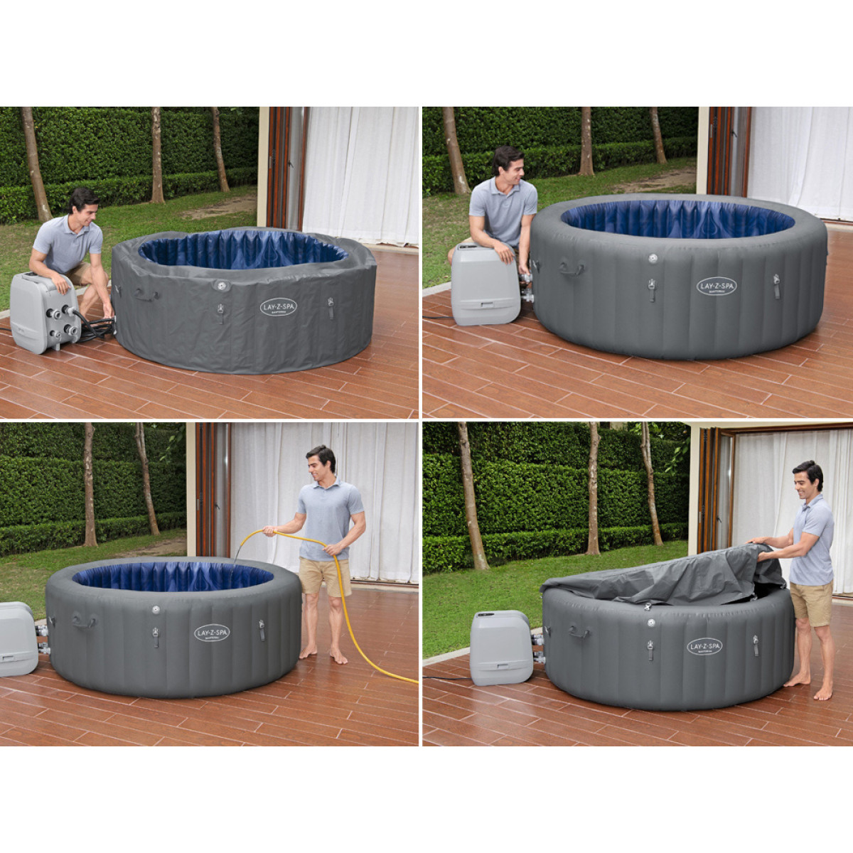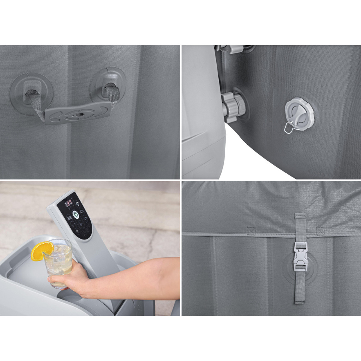 Multifunkcinė pompa: Pridedama pompa ne tik greitai pripučia baseino sienas, bet ir atsako už vandens šildymą bei filtravimą, taip pat masažo sistemos valdymą! Dėl to visos funkcijos yra prieinamos viename įrenginyje! Pompa lengvai pasiekiama iš spa vidų ir turi gėrimų ar užkandžių laikiklį.