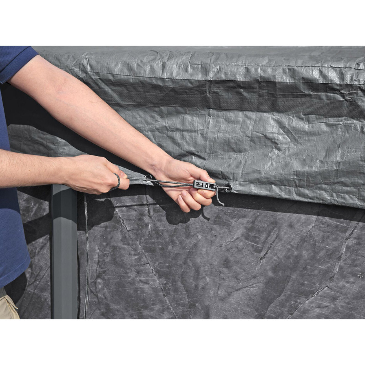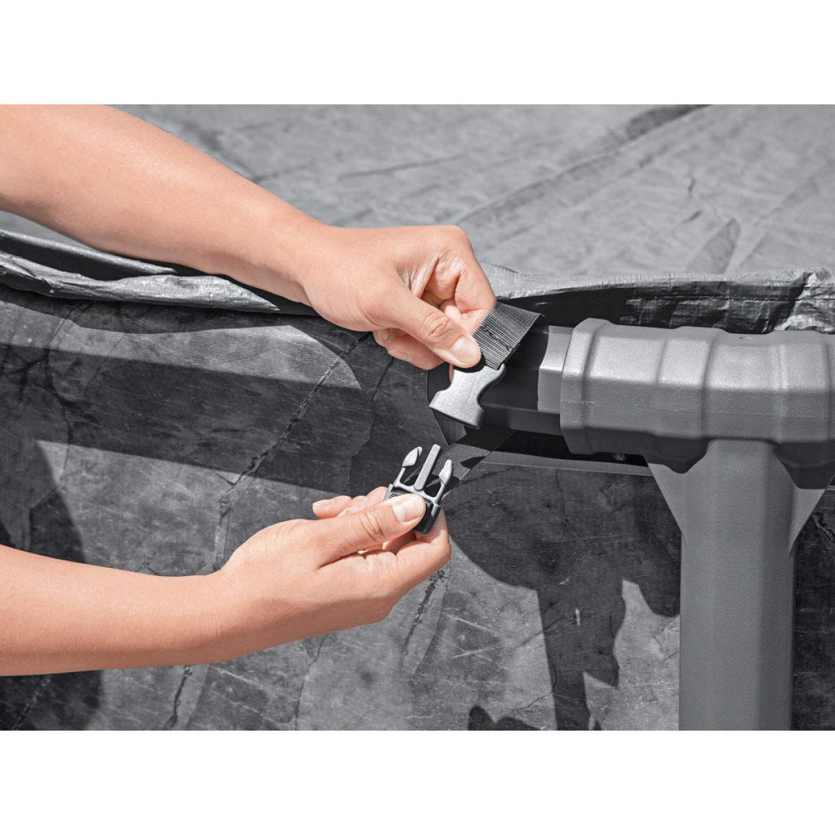 Patobulinta Polar-Shield danga leidžia naudoti visus metus ir išlaiko savo savybes net esant žemai temperatūrai, iki -25°C. Vėjo atsparus užspaudimo mechanizmas užtikrina stabilų uždangalo laikymąsi ant baseino daugeliu standartinių oro sąlygų.