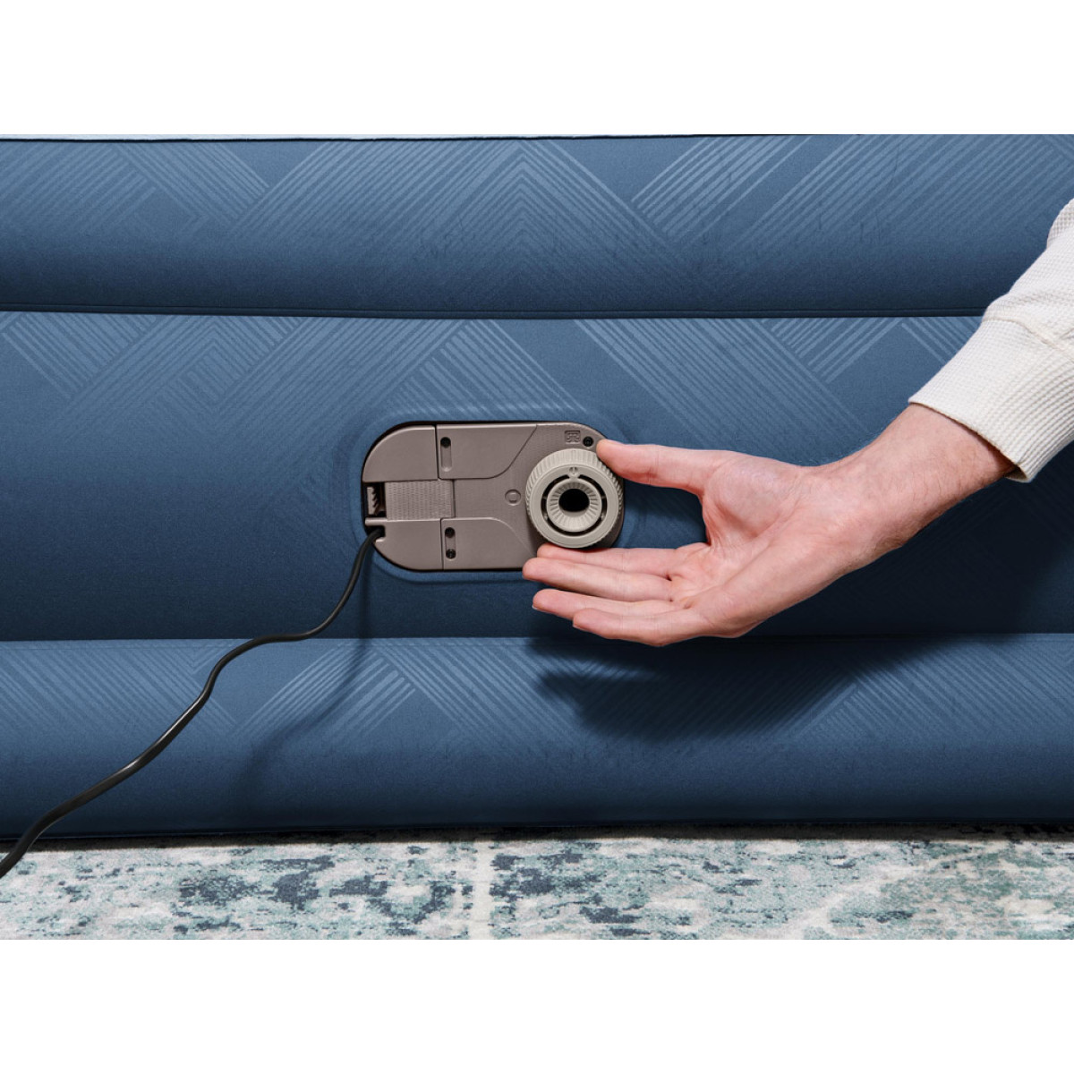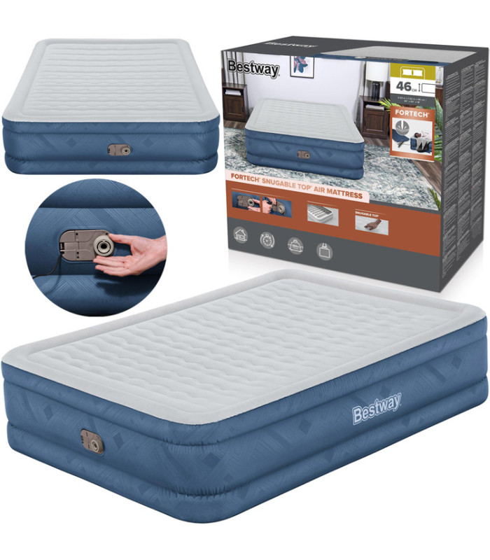 Čiužinys turi integruotą elektrinę pompą (220-240V), kuri leidžia pripūsti čiužinį vos per 3 minutes. Taip pat galima naudoti rankinę arba kojinę pompą, jei nėra elektros prieigos.