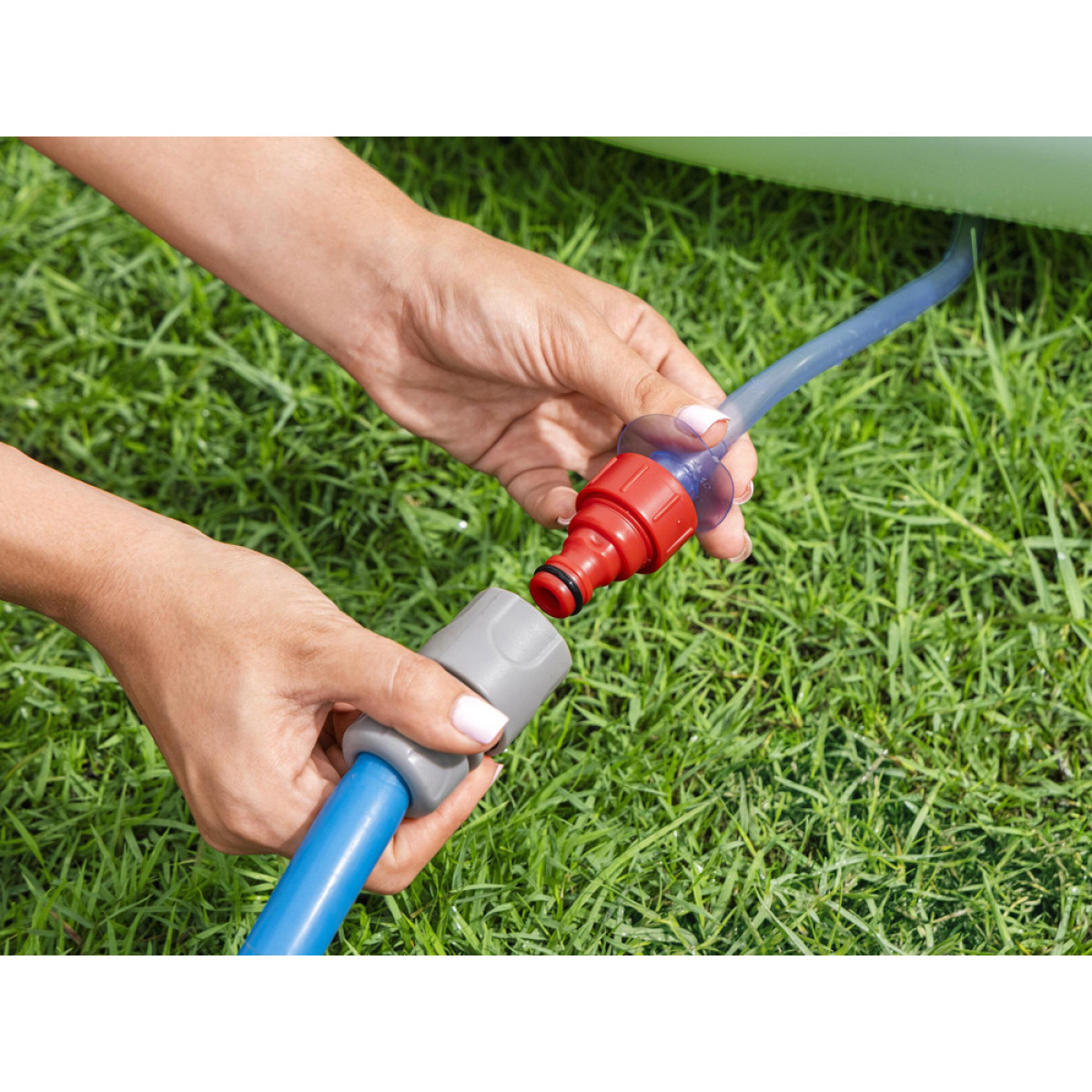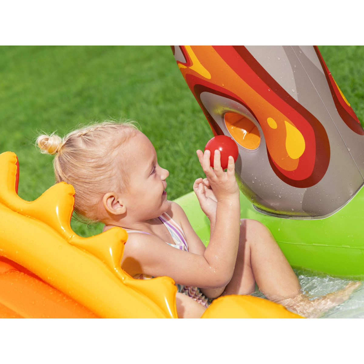 Vaikai gali naudotis čiuožykla su minkštu nusileidimu, kuri užtikrina saugų nusileidimą į baseiną, taip pat žaisti šalia vulkaninės arkos su integruotu purkštuvu ir kamuoliukų rūšiavimo angomis. Komplekte yra nuimamos vandens kamuolės, įskaitant Mini Vulkaną su reguliuojamu vandens srautu, kas dar labiau pagyvina žaidimą. Prijungimas prie standartinio sodo žarnos leidžia lengvai įjungti purkštuvą ir greitai atsigaivinti karštomis dienomis.