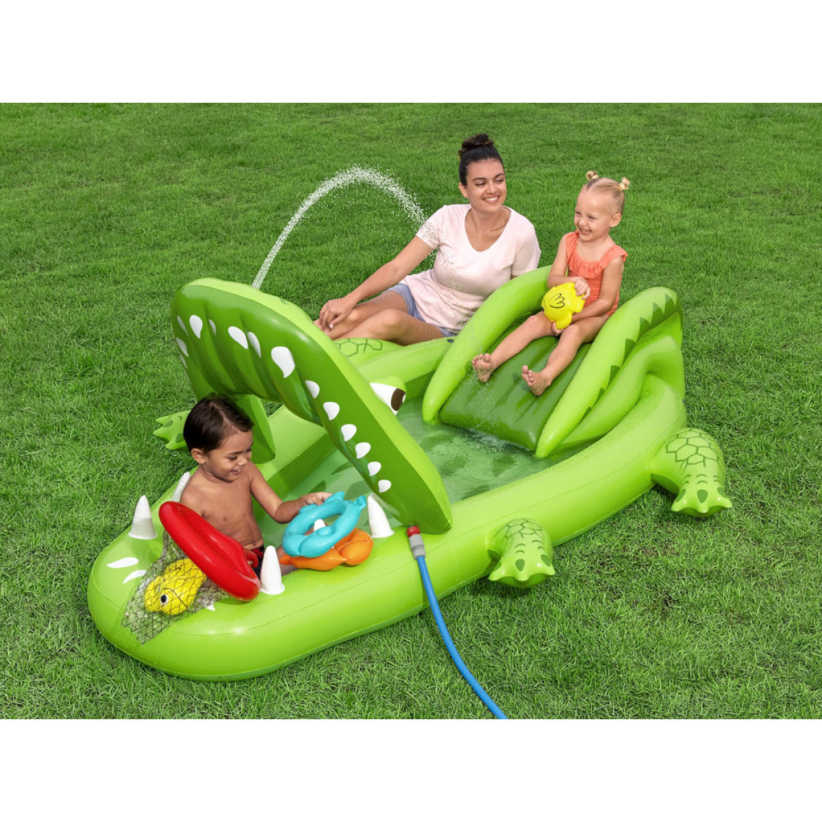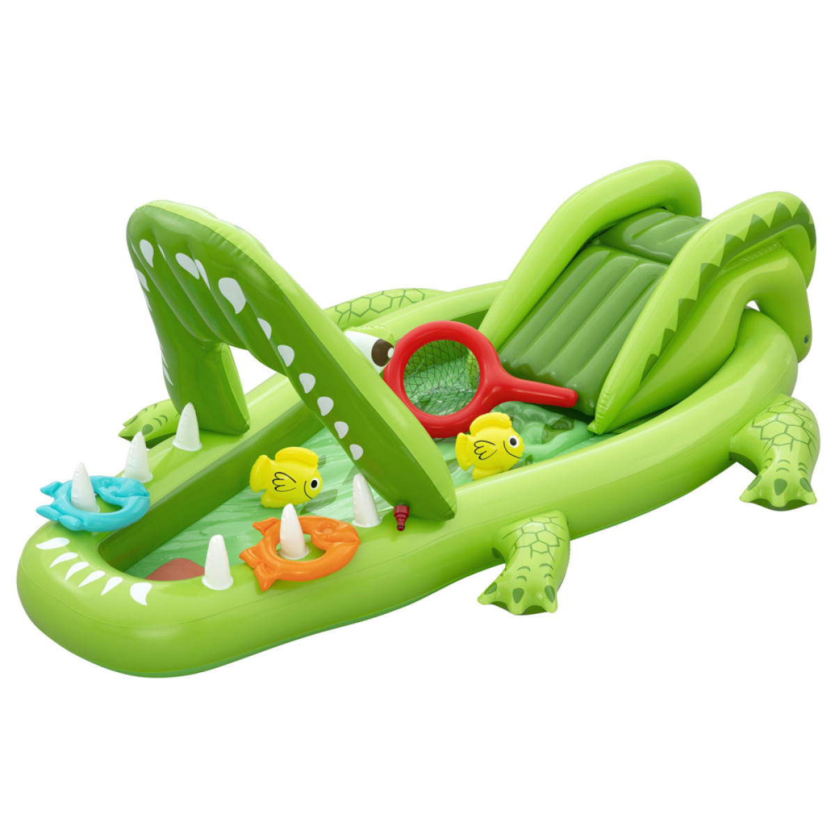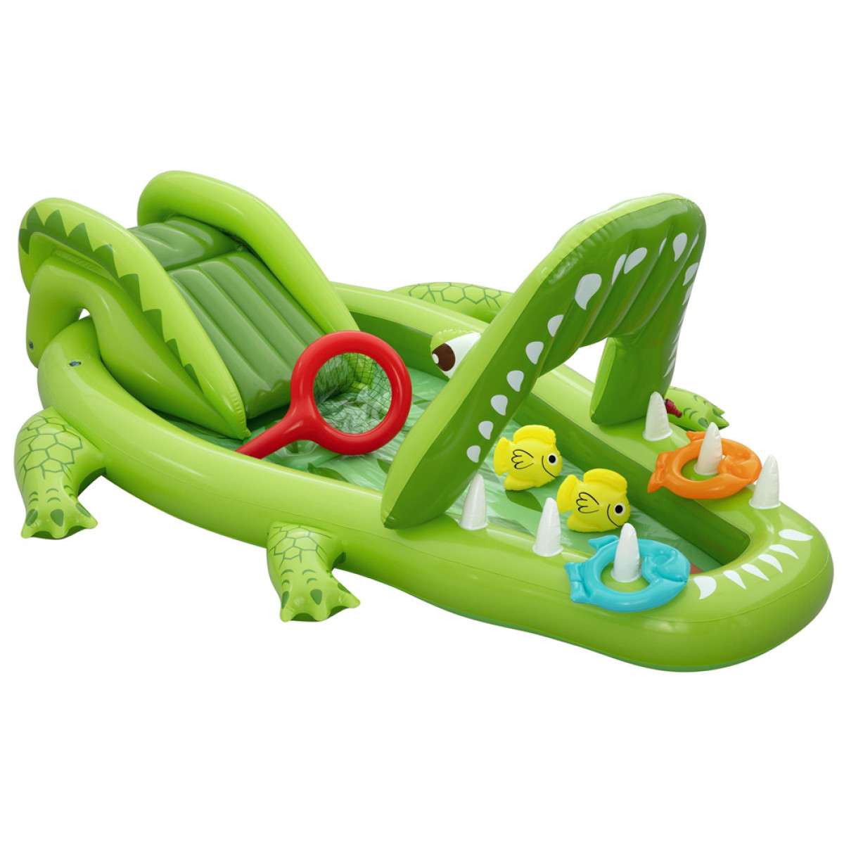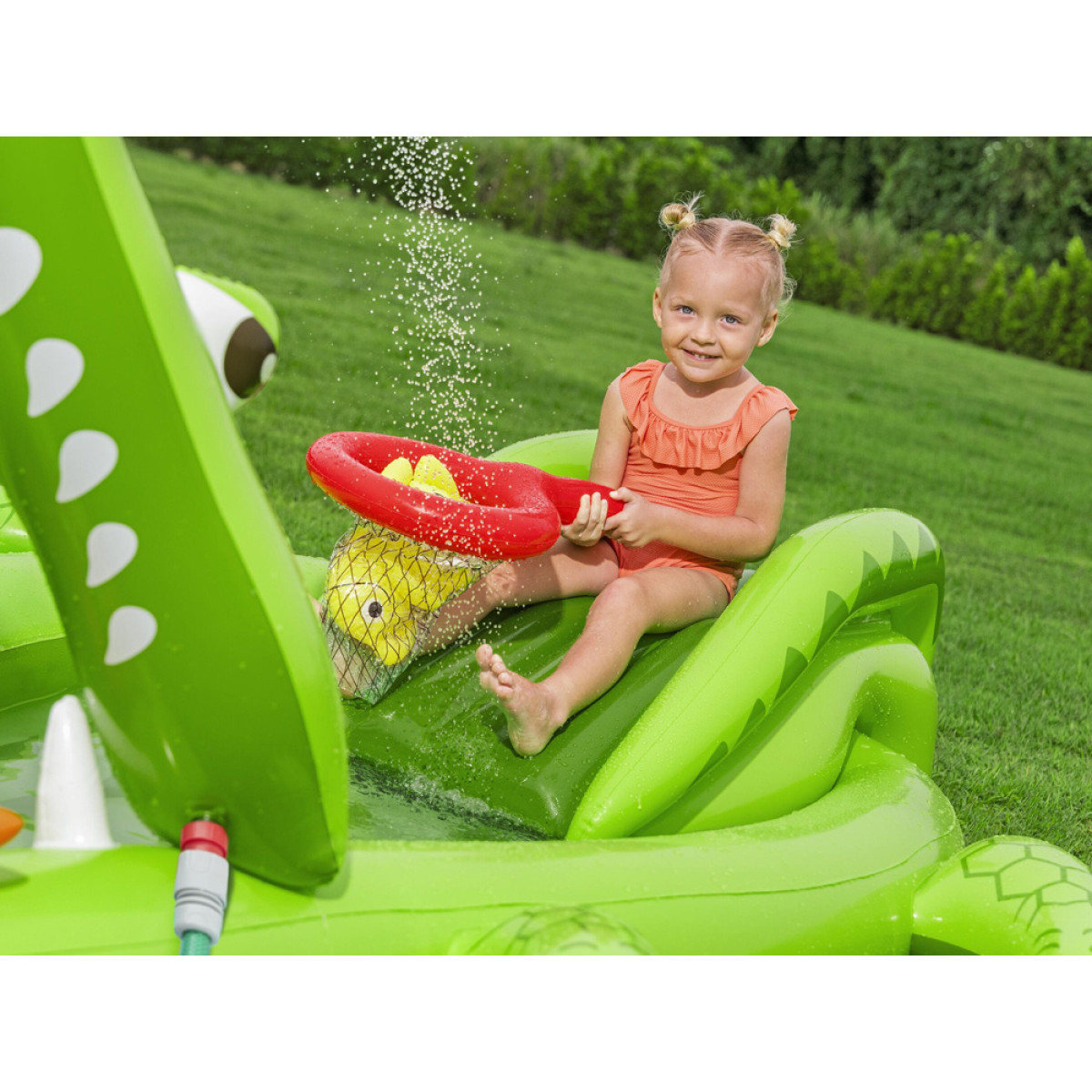 Vaikai gali naudotis čiuožykla su minkštu nusileidimu, kuri užtikrina saugų nuslydimą į vandens baseiną. Purškiklis krokodilo snukyje purškia vandenį čiuožyklos link, padidindamas pramogos patrauklumą ir atvėsinimą karštomis dienomis. Pramogą papildo pripučiamas žuvų gaudymo tinklas Puffy Pal™ ir žiedų metimo žaidimas, kuriame naudojami du pripučiami žiedai, skatinantys vaikų taiklumą, tikslumą ir refleksus.