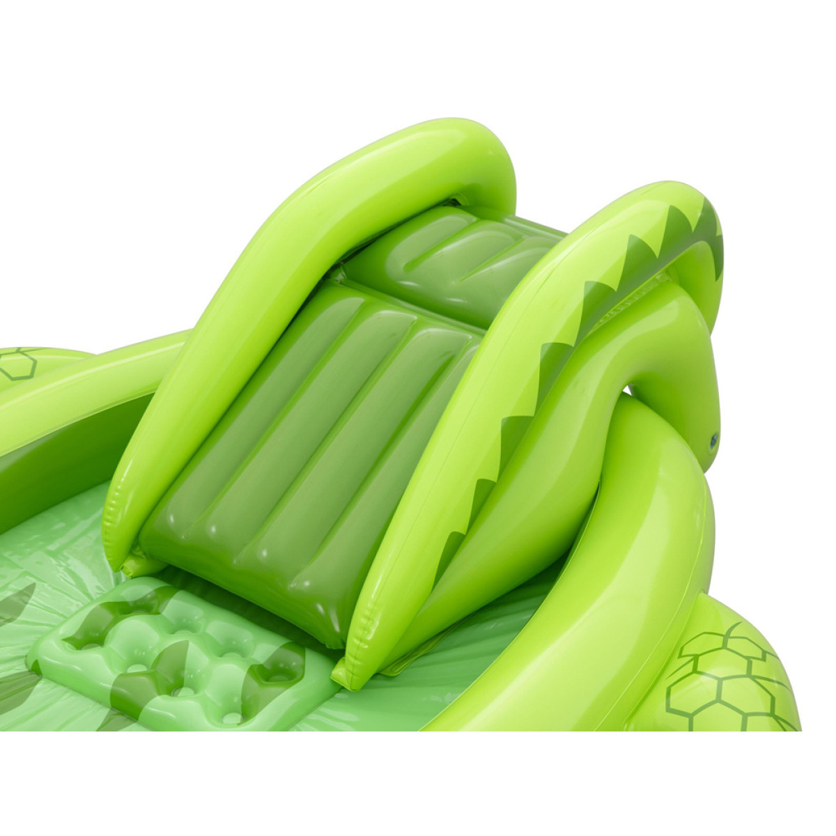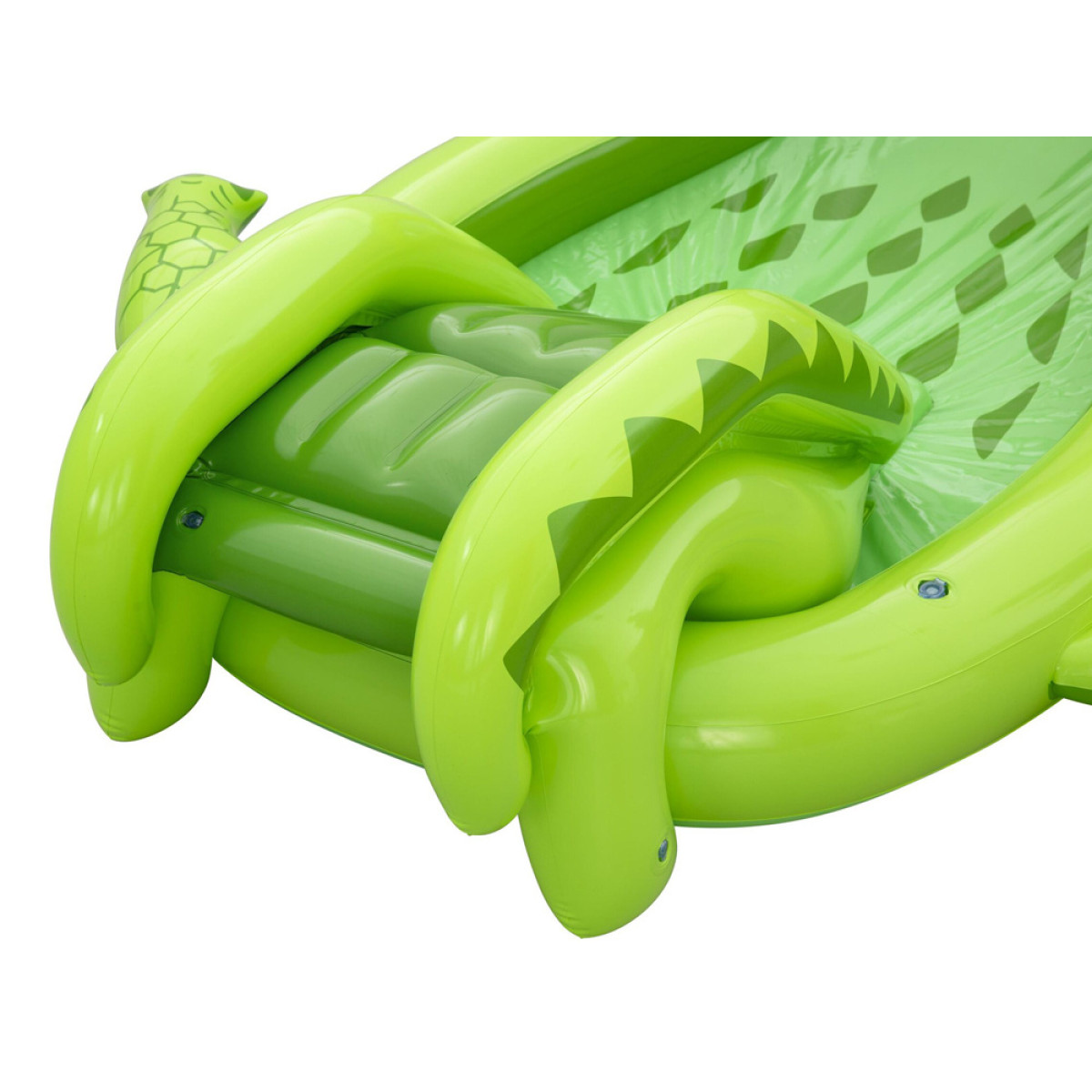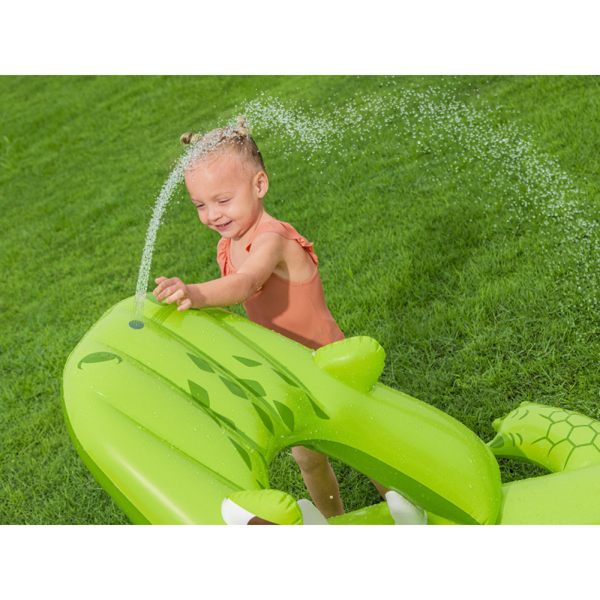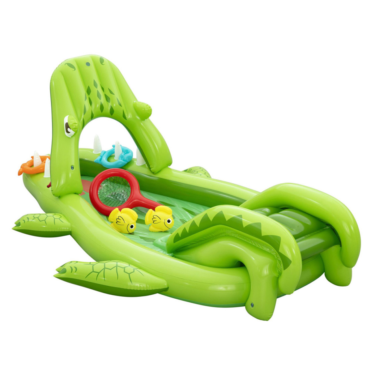 Vaikai gali naudotis čiuožykla su minkštu nusileidimu, kuri užtikrina saugų nuslydimą į vandens baseiną. Purškiklis krokodilo snukyje purškia vandenį čiuožyklos link, padidindamas pramogos patrauklumą ir atvėsinimą karštomis dienomis. Pramogą papildo pripučiamas žuvų gaudymo tinklas Puffy Pal™ ir žiedų metimo žaidimas, kuriame naudojami du pripučiami žiedai, skatinantys vaikų taiklumą, tikslumą ir refleksus.