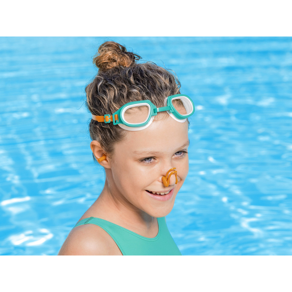 - Lengvas ir lankstus nosies spaustukas bei minkšti ausų kištukai, sulaikantys vandenį