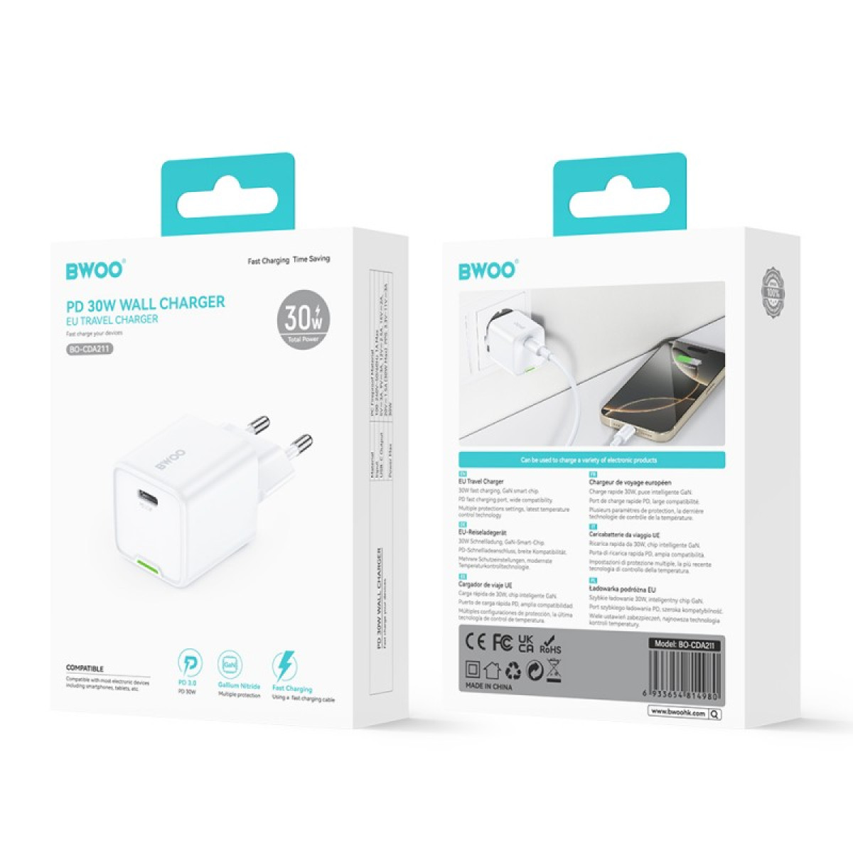BWOO GaN PD sieninis įkroviklis 1x USB-C prievadas 1A 30W, baltas