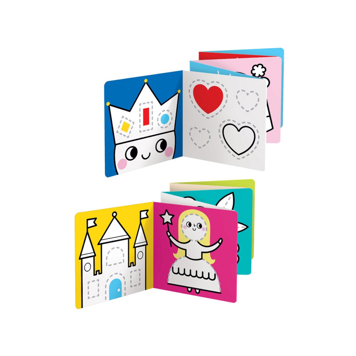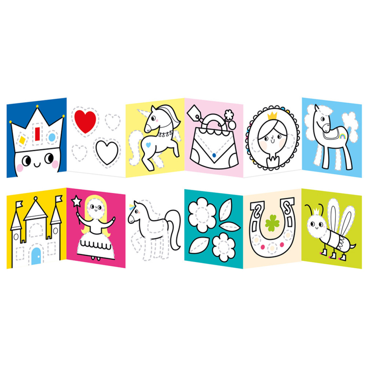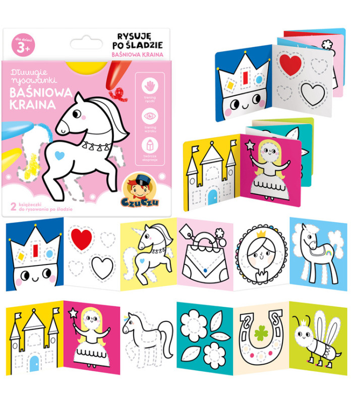 Kūrybingas rinkinys: jame yra 2 ilgos harmonikos formos knygelės. Populiari tarp vaikų tematika skatina juos naudoti pieštukus ir dažus, įtraukiant magiškas iliustracijas, kurios įkvepia kūrybiškam žaidimui. Pieškite pagal pavyzdį, spalvinkite, pridėkite savo elementus, lavindami manualinius įgūdžius ir vaizduotę.