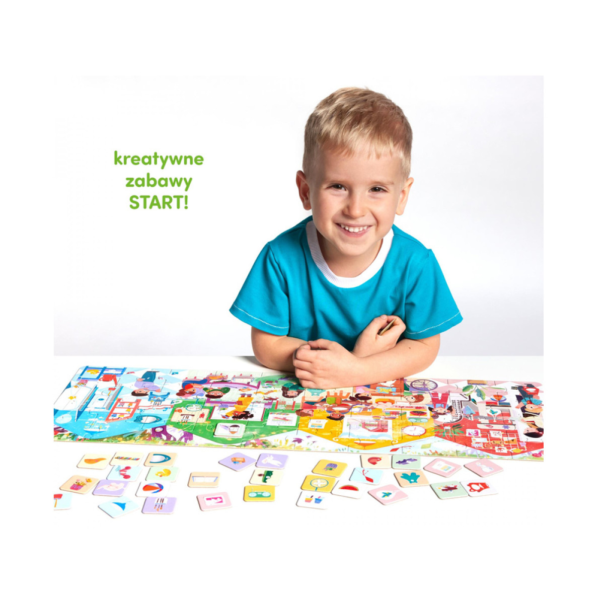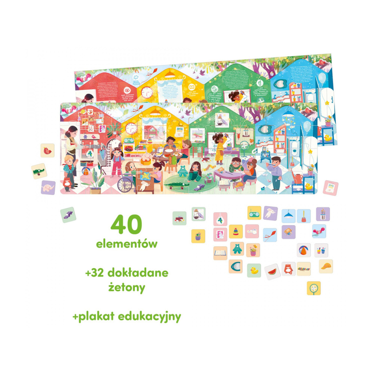 Sveiki atvykę į darželį – čia visada vyksta kas nors įdomaus! Spalvinga ir detali dėlionė, sudaryta iš 40 dalių, perkelia vaikus į linksmą darželio pasaulį. Susipažinkite su įvairiomis patalpomis ir sužinokite, ką vaikai veikia per dieną! Papildomi 32 detalių kortelės – tai puiki proga ugdyti pastabumą, o plakatas su įdomybėmis ir veiklų idėjomis padeda mažyliams (ir tėvams) susipažinti su darželio gyvenimu.
