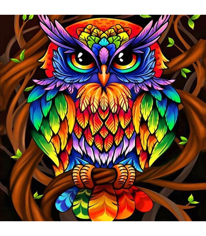 Rinkinyje rasite viską, ko reikia savarankiškai sukurti 5d paveikslą, kurio dydis yra 40 x 50 cm. Spalvingas pelėdos motyvas ypač patiks gyvūnų mylėtojams ir visiems, kurie vertina ryškias, dekoratyvias kompozicijas.