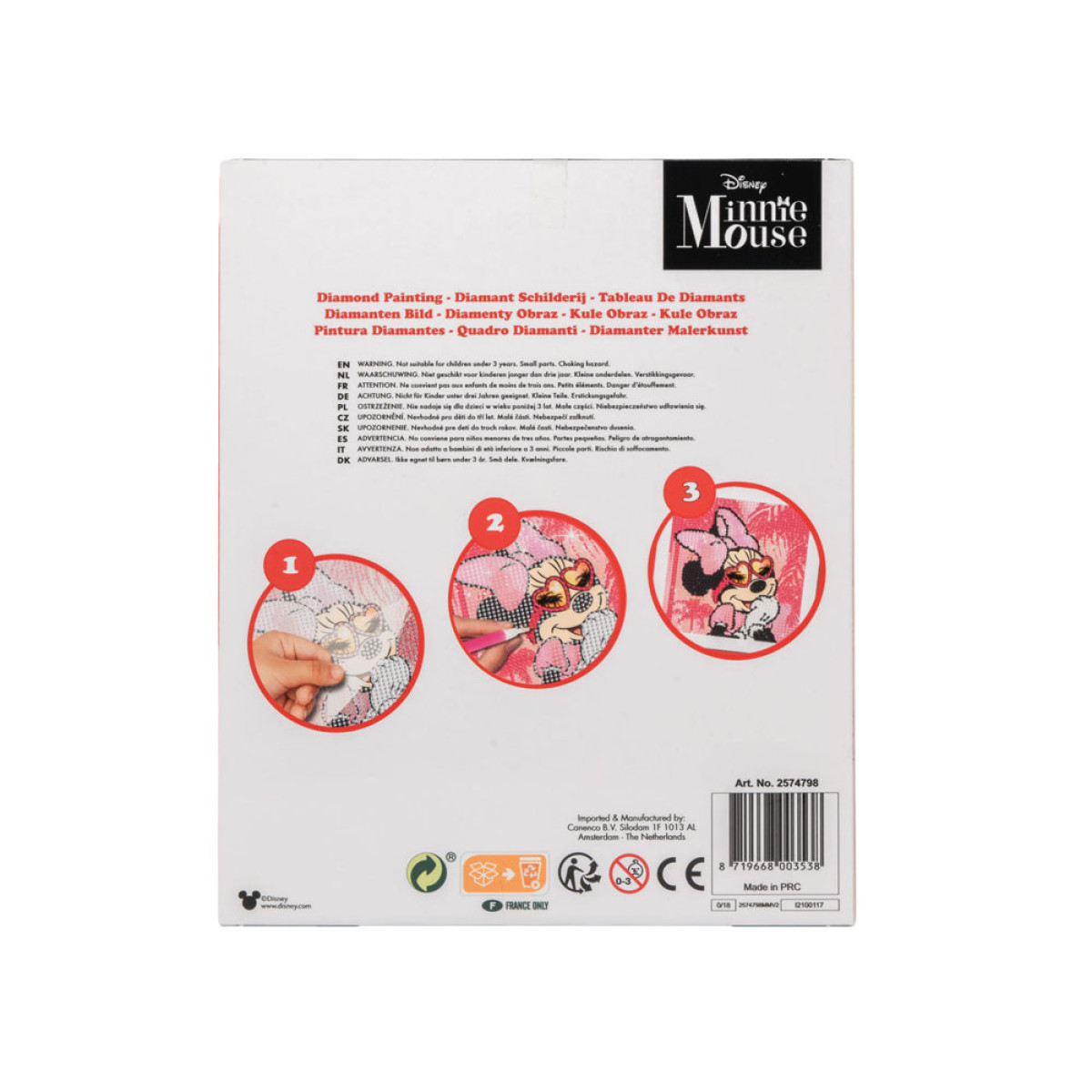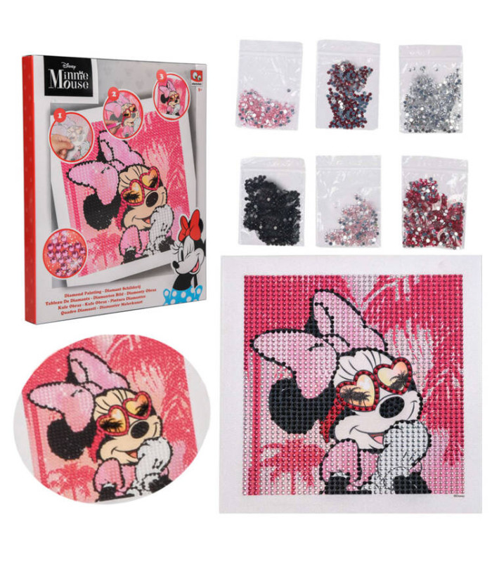 - Spalvingas Minnie Peliukės paveikslas, padengtas klijais, kurie palengvina deimantų klijavimą. Ant paveikslo yra atspausdintos raidės, kurios padeda išlaikyti spalvų tvarką. Tačiau galutinis Minnie Peliukės rezultatas priklauso tik nuo jūsų kūrybiškumo.