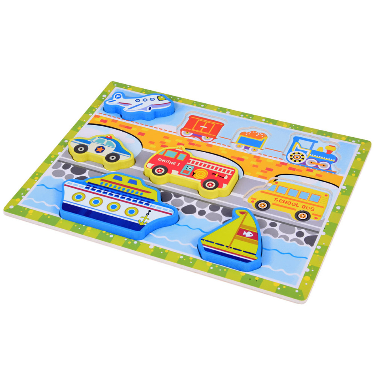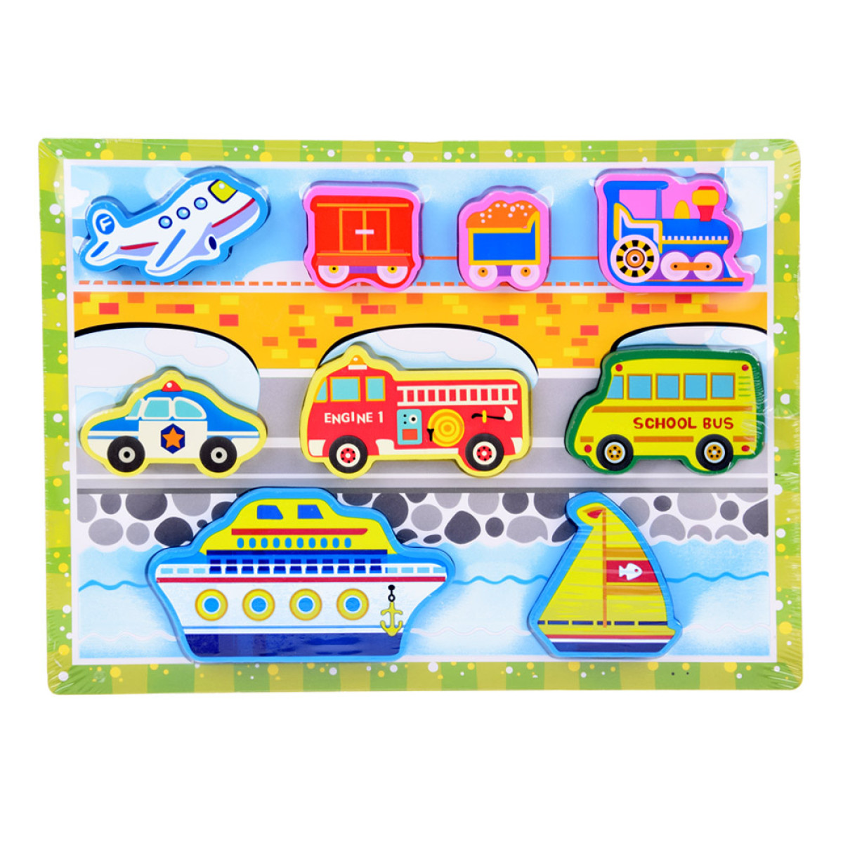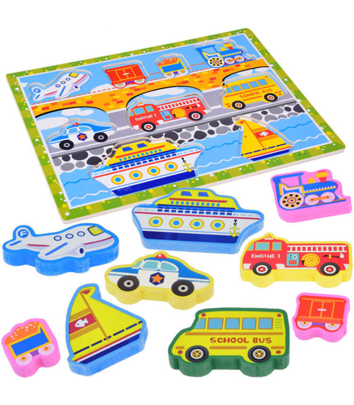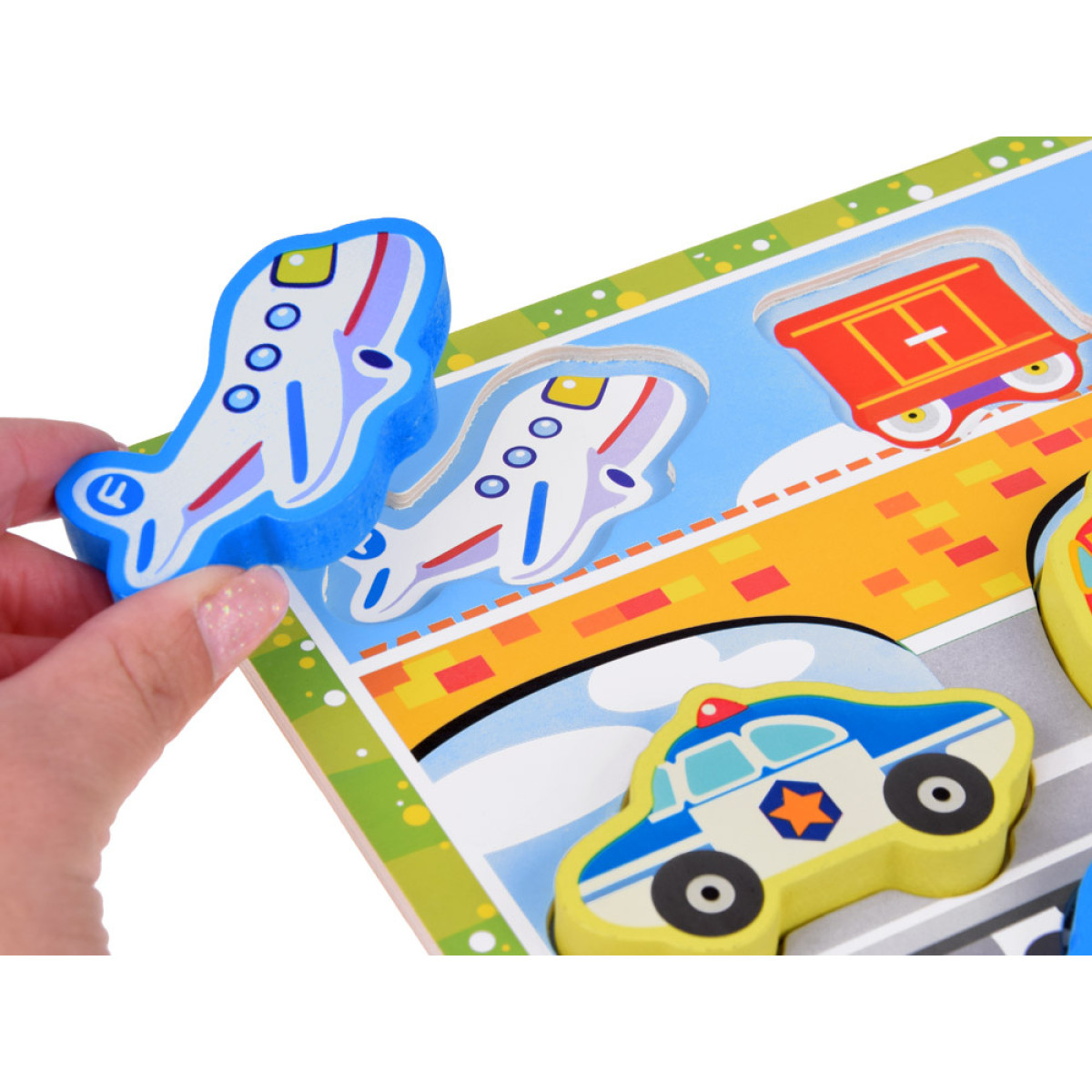 Vaiko užduotis yra suderinti dėlionės dalis su iliustracija ir forma ant medinės lentos. Transporto priemonėmis galima žaisti ir atskirai, kuriant įdomias istorijas.