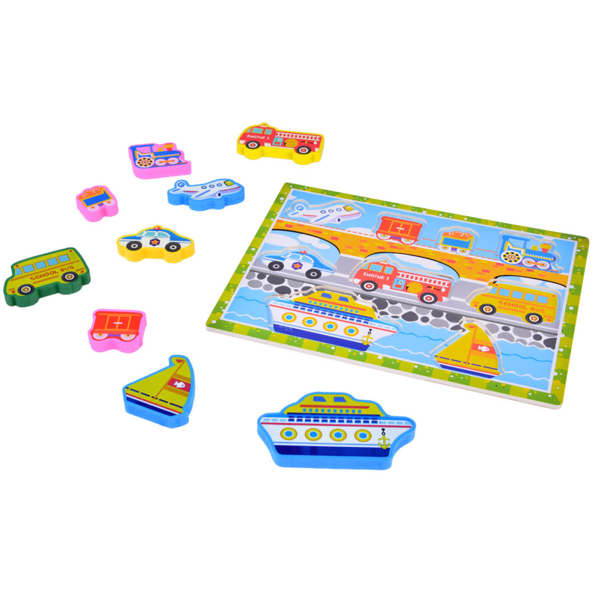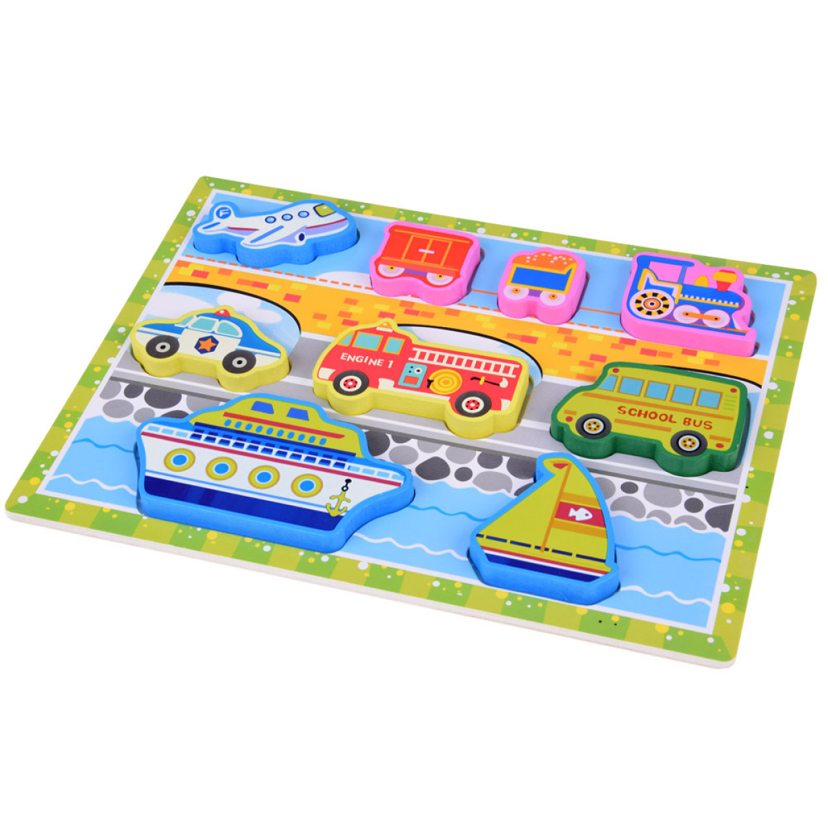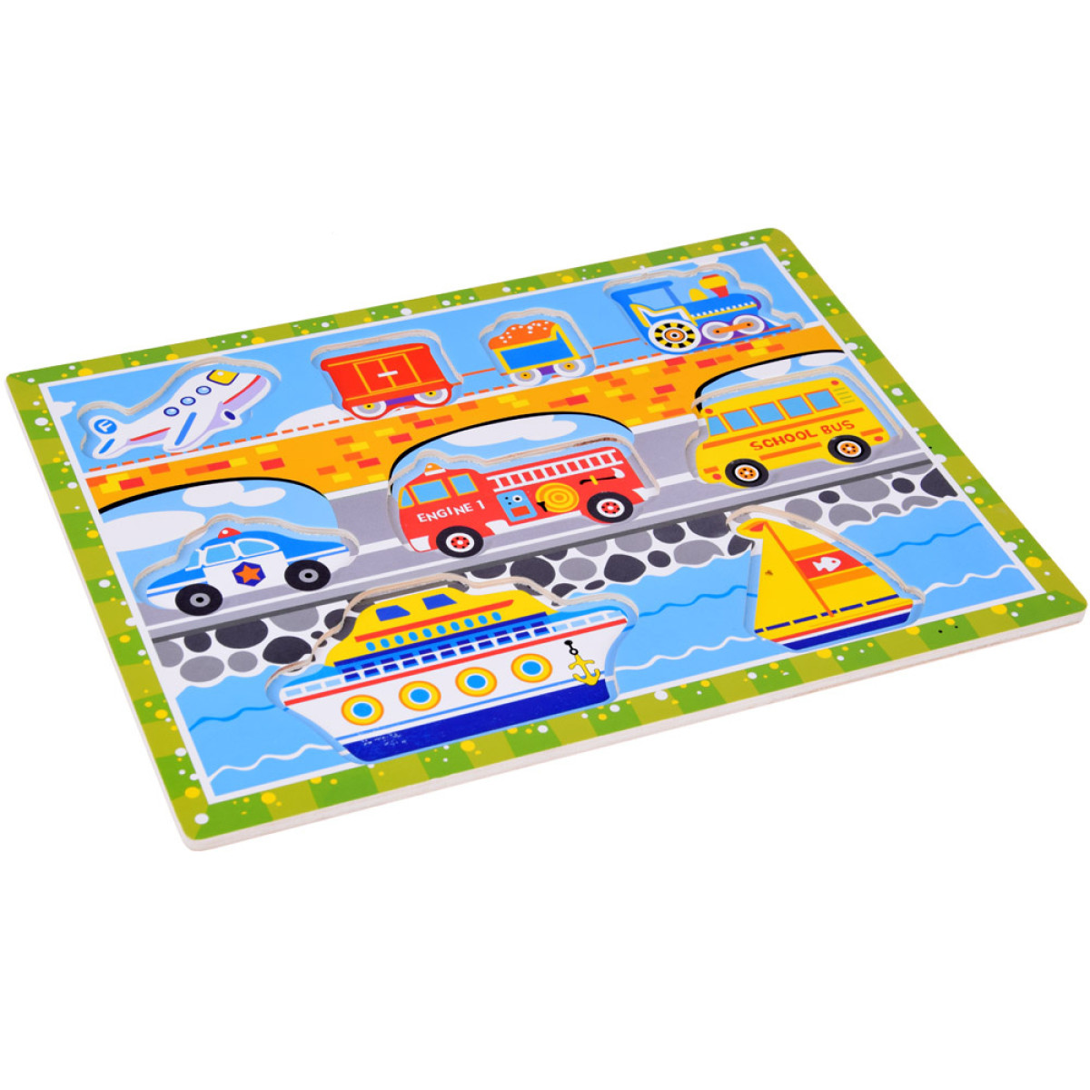 Vaiko užduotis yra suderinti dėlionės dalis su iliustracija ir forma ant medinės lentos. Transporto priemonėmis galima žaisti ir atskirai, kuriant įdomias istorijas.