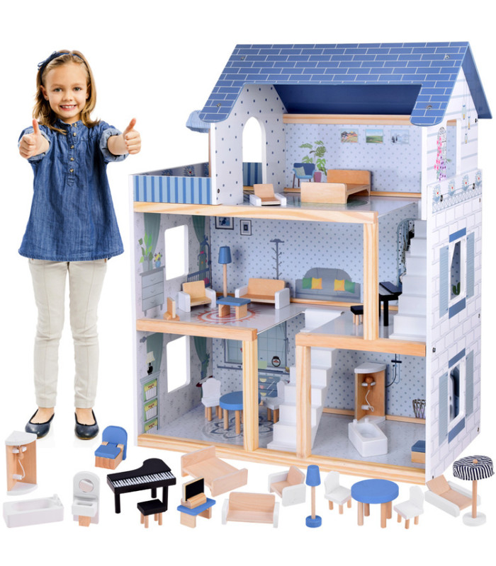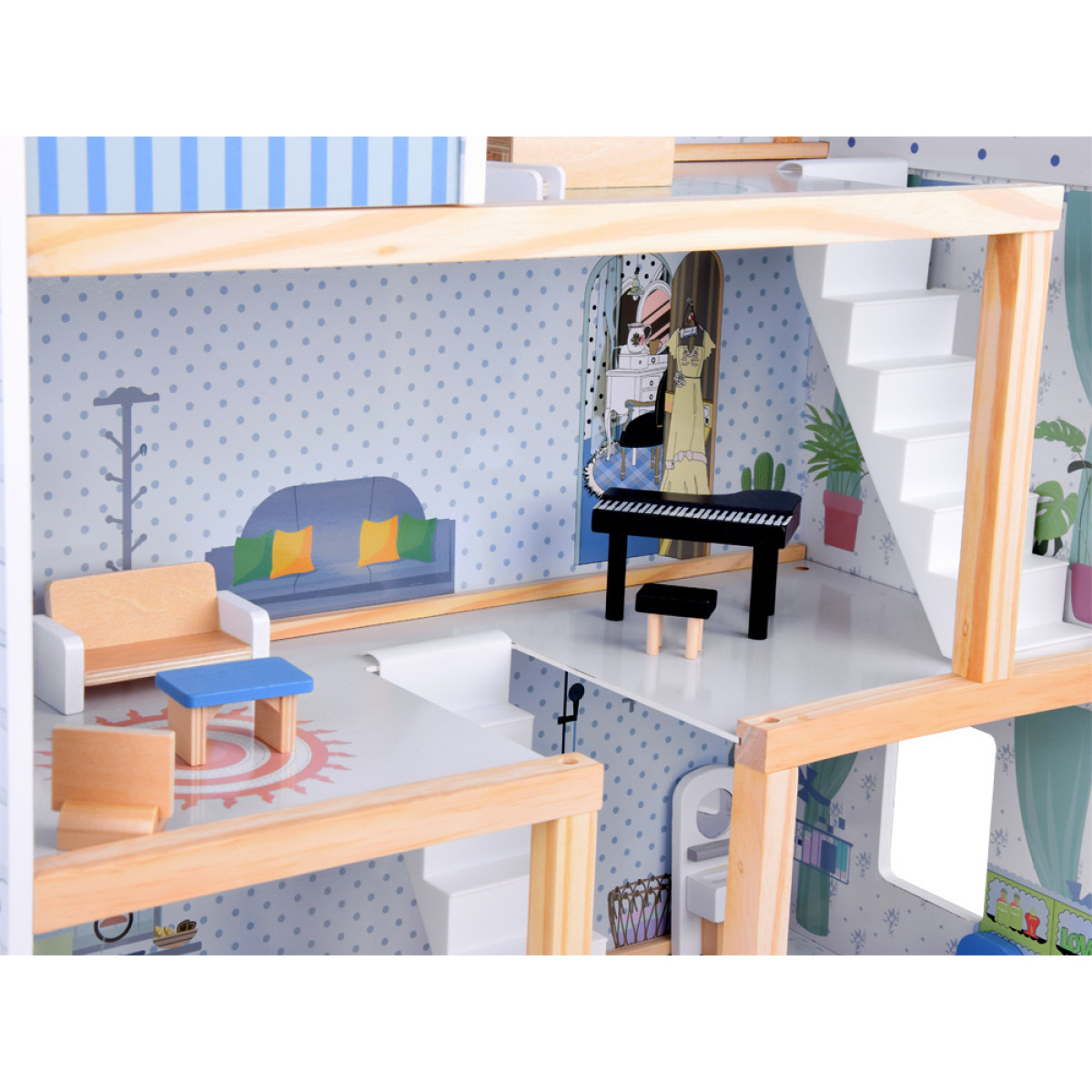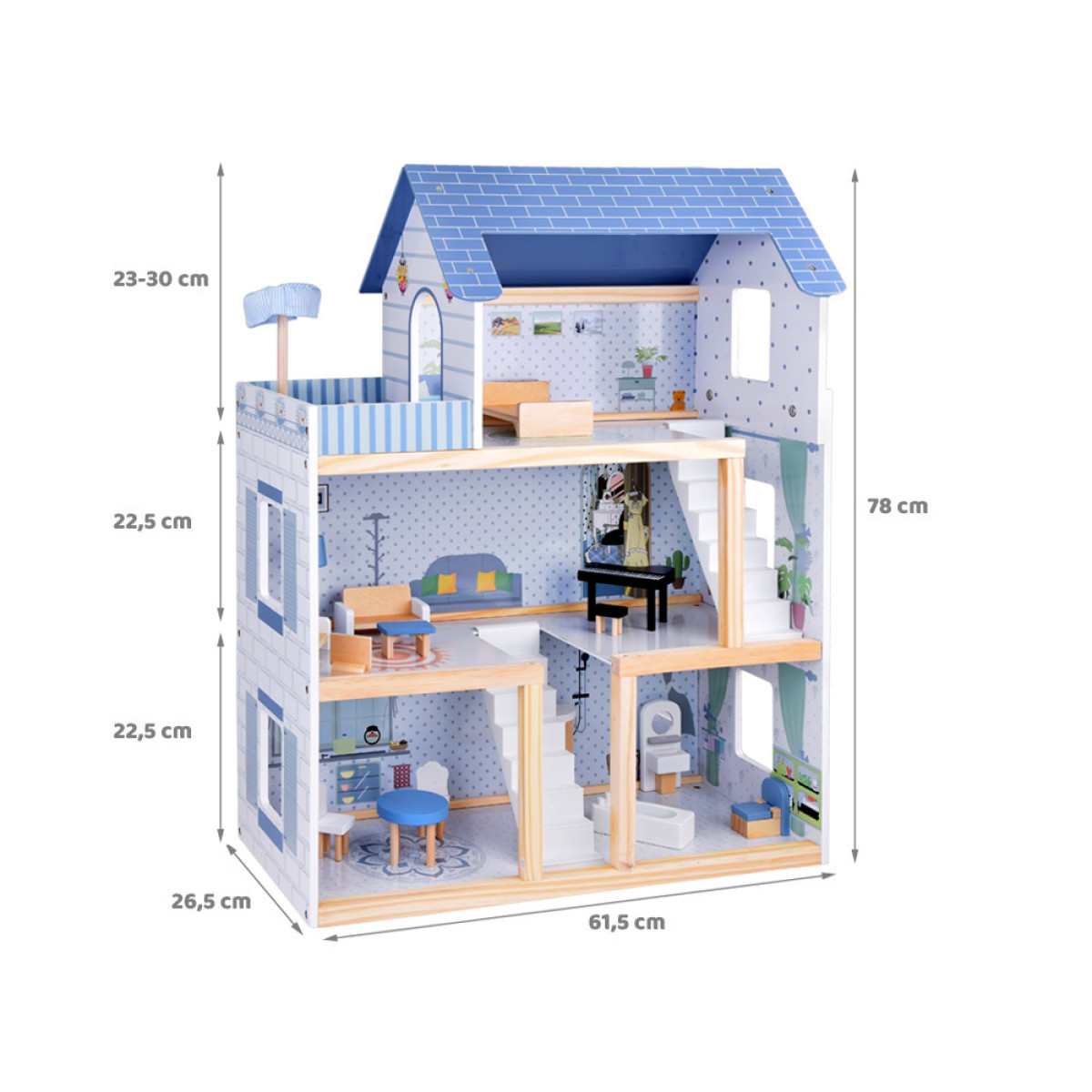 Medinis lėlių namelis yra kiekvienos mergaitės svajonė, ypač jei ji nėra rožinės spalvos gerbėja. Šis subtilus mėlynas namelis tikrai patiks. 3 aukštai su 3 erdviais kambariais, virtuve ir vonios kambariu. Visi elementai pagaminti su dideliu dėmesiu detalėms. Baldai yra natūralaus medžio su baltais ir mėlynais atspalviais. Kiekviena lėlė jausis patogiai tokiame namelyje.