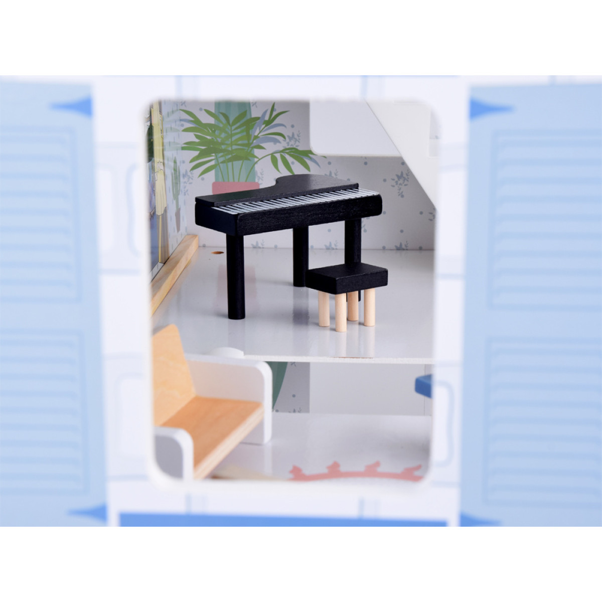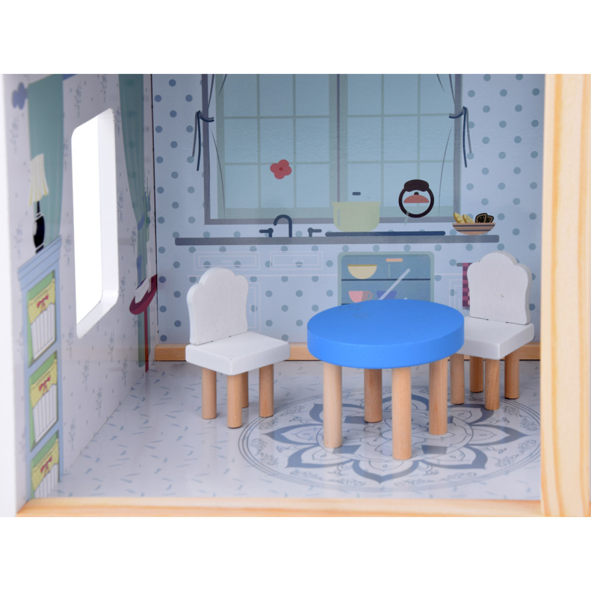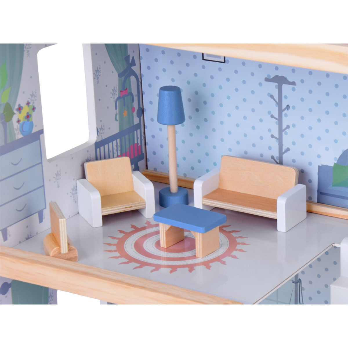 Medinis lėlių namelis yra kiekvienos mergaitės svajonė, ypač jei ji nėra rožinės spalvos gerbėja. Šis subtilus mėlynas namelis tikrai patiks. 3 aukštai su 3 erdviais kambariais, virtuve ir vonios kambariu. Visi elementai pagaminti su dideliu dėmesiu detalėms. Baldai yra natūralaus medžio su baltais ir mėlynais atspalviais. Kiekviena lėlė jausis patogiai tokiame namelyje.
